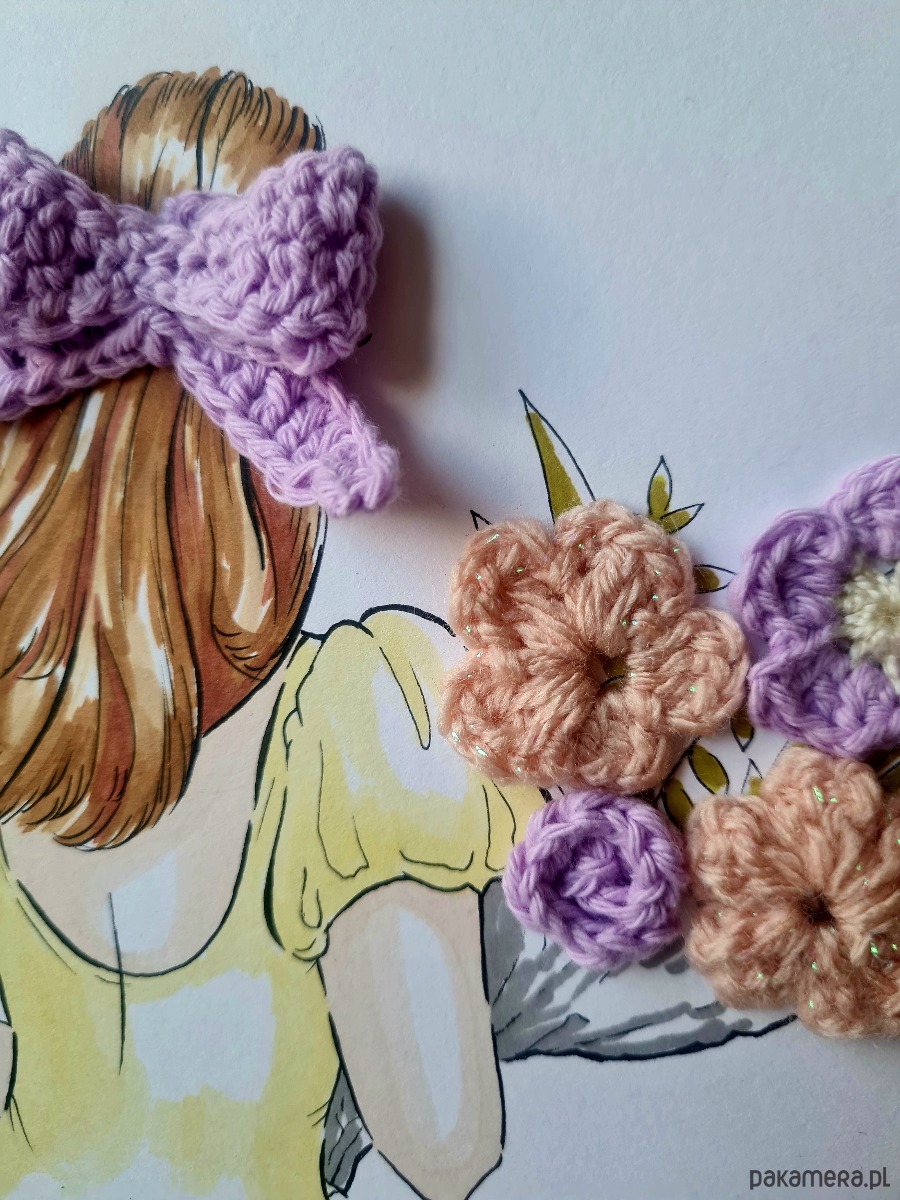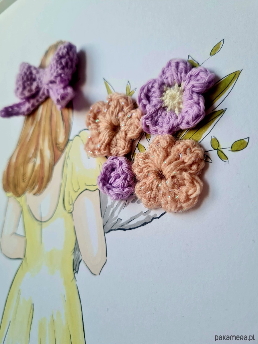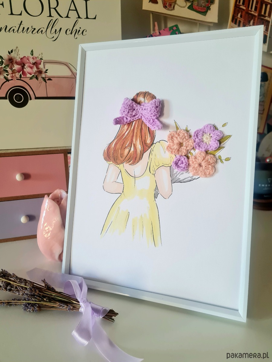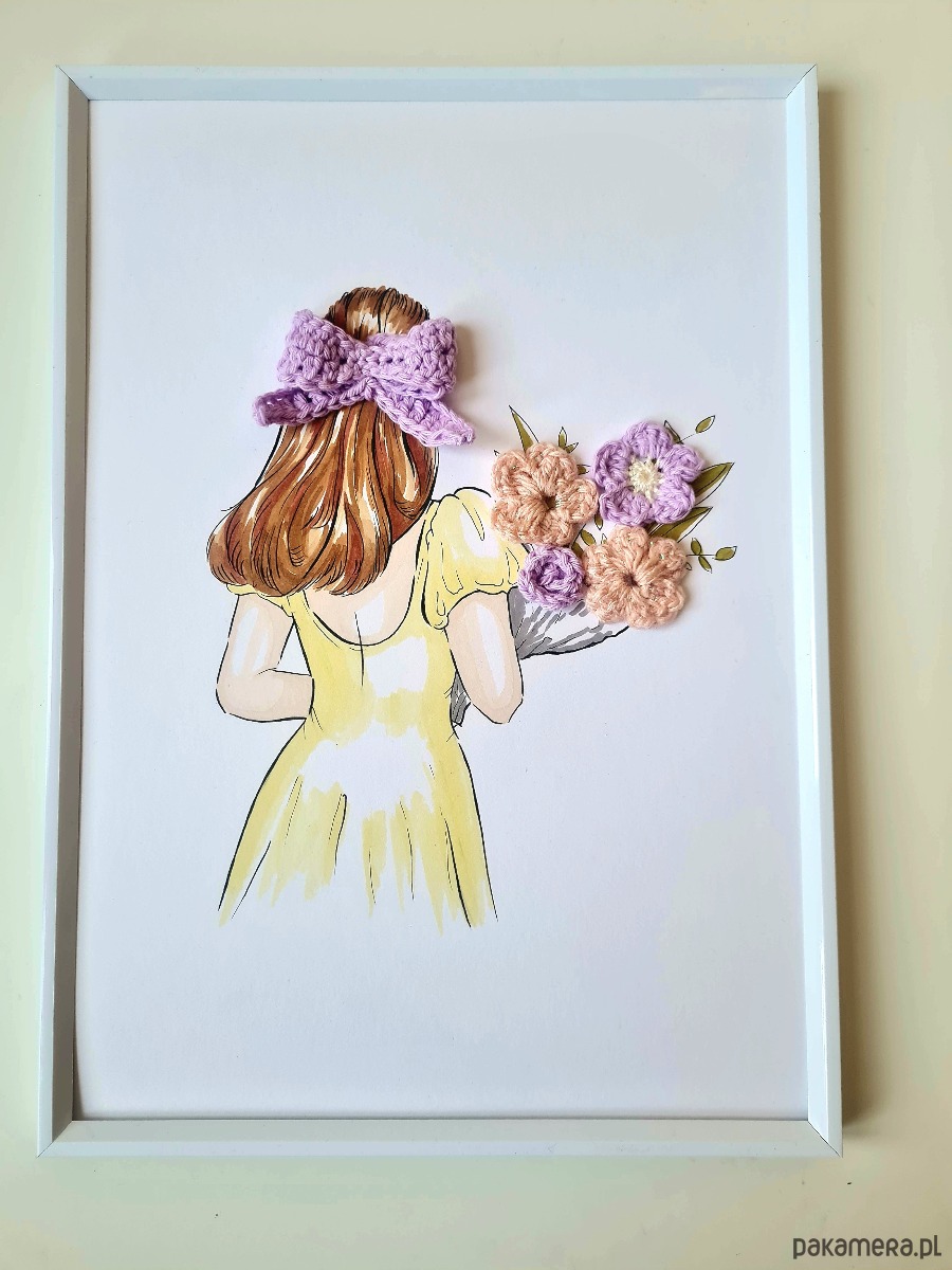 Unikalny obrazek z nietypowym twistem: to połączenie ręcznie malowanej ilustracji z robótką na szydełku. Tajemnicza dziewczyna w delikatnej sukience niesie bukiet pastelowych kwiatów, a włosy ma spięte uroczą liliową kokardą. Scenka przywodzi na myśl rześki letni poranek w bujnym ogrodzie, spokój i subtelną dziewczęcość.