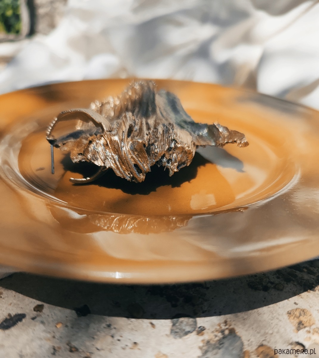 Absolutnie popisowy projekt! Duży pojedynczy i niesamowicie lekki kolczyk z suszonego liścia wielkiej agawy znad Morza Adriatyckiego.