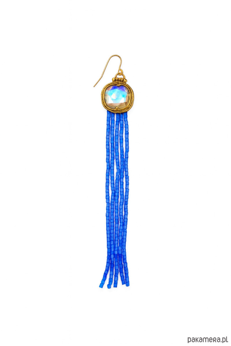 Długi pojedynczy kolczyk z kryształową iskrą i kobaltowymi frędzlami.
