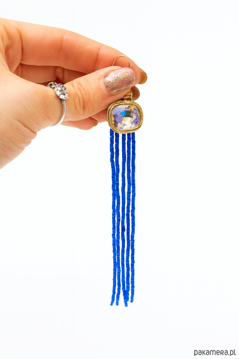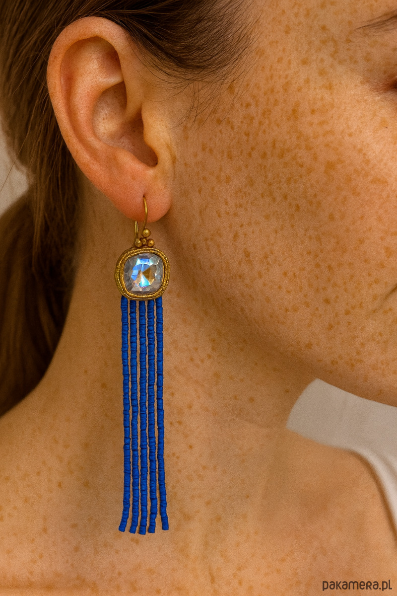Z kryształowej oprawy swobodnie opadają długie koralikowe frędzle z matowych, kobaltowych perełek. Delikatnie poruszają się przy każdym ruchu głowy, tworząc spektakularny, bardzo efektowny akcent.