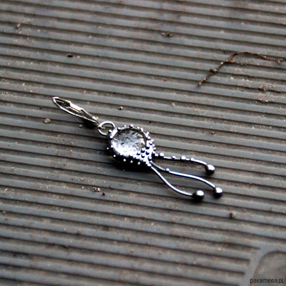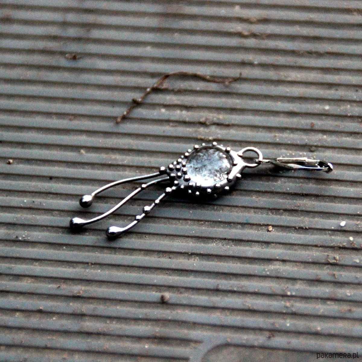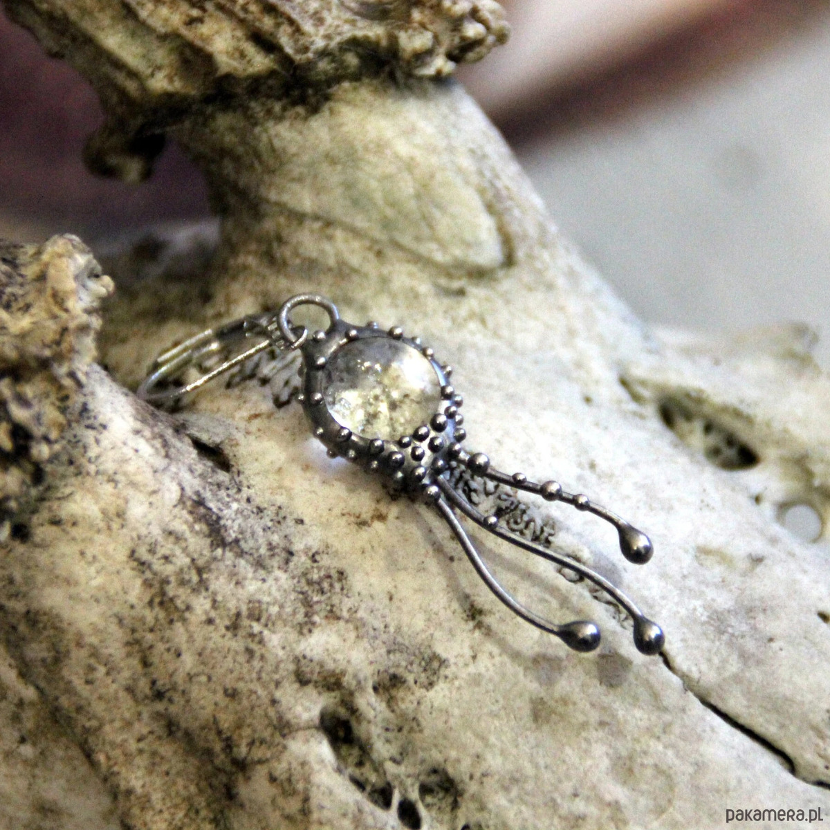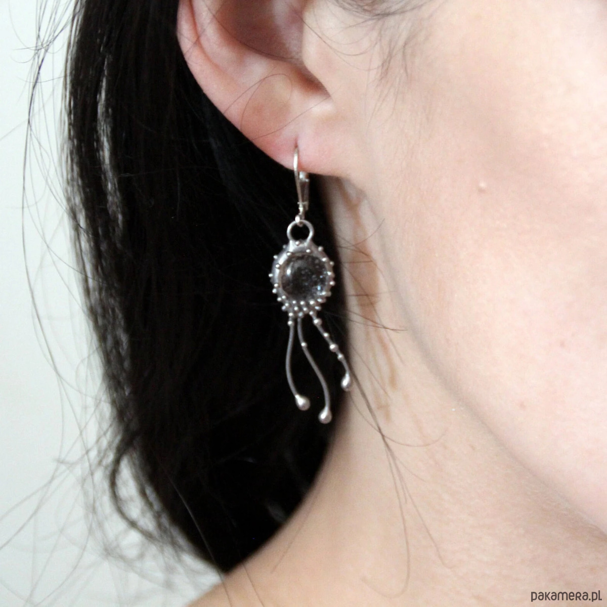 Kolczyki w stylu secesyjnym z motywem meduzy, wykonane ręcznie z miedzi, cyny, stali i szkła przezroczystego. Kolczyki są lekkie i wytrzymałe. Wszystkie elementy są ręcznie wykonane, co gwarantuje indywidualność każdego produktu wykonanego w pracowni Yadovito. Stop cyny i miedzi jest polerowany roztworem wykończeniowym, aby nadać biżuterii szlachetny wygląd i jednocześnie zapobiec utlenianiu się metalu.Rozmiar około 4/1 cm . Kolor srebrny/bezbarwny.