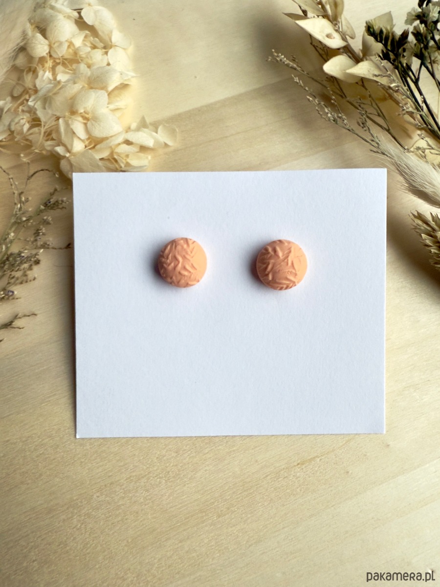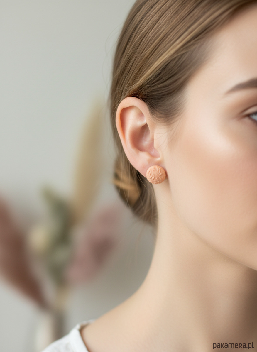 Delikatne, wypukłe kolczyki w kształcie małych kulek (14 mm), wykonane z gliny polimerowej z subtelnym, roślinnym wzorem. Ich trójwymiarowa forma pięknie układa się na uchu, dodając lekkości i naturalnego charakteru każdej stylizacji.