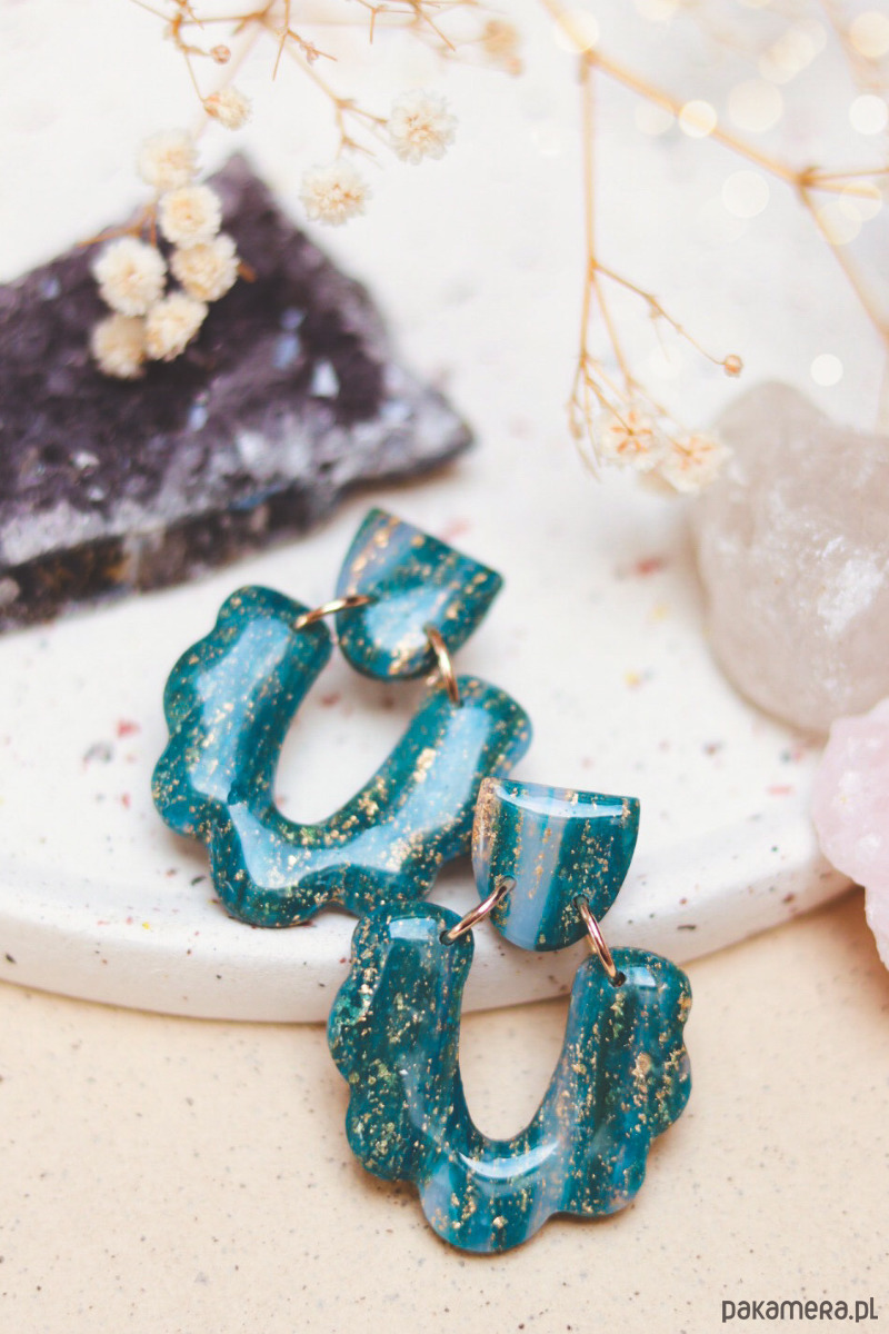 Efektowne i eleganckie kolczyki dla miłośniczek blasku. Oryginalny, nieregularny wzór przywodzi na myśl naturalny kamień. Kolczyki utrzymane są w zielono-morskiej kolorystyce ze złotymi akcentami.