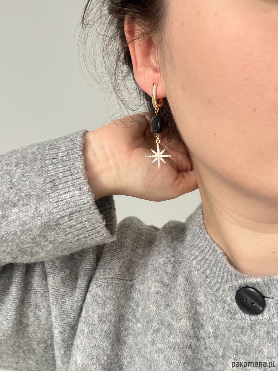 Kolczyki wykonane są z zapięć z mosiądzu rodowanego złotem i kamieni Agatu Czarnego i zawieszek z mosiądzu rodowanego złotem.