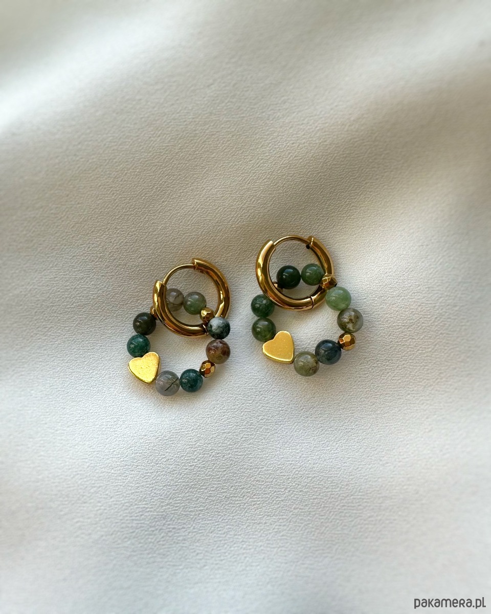 Wyjątkowe kolczyki z agatu indyjskiego w zielonych odcieniach i złotego hematytu. Subtelne i kobiece - dla każdej romantyczki! Idealny pasują do codziennych stylizacji.