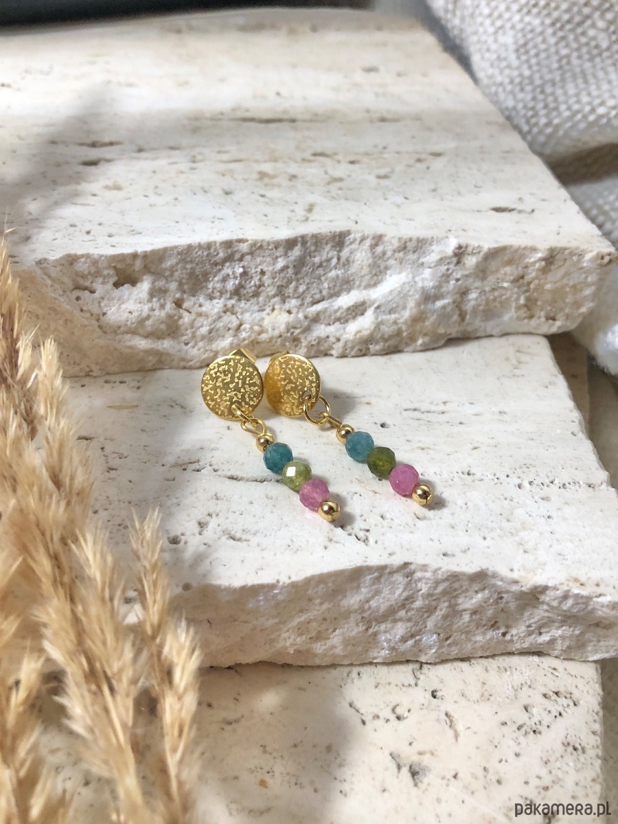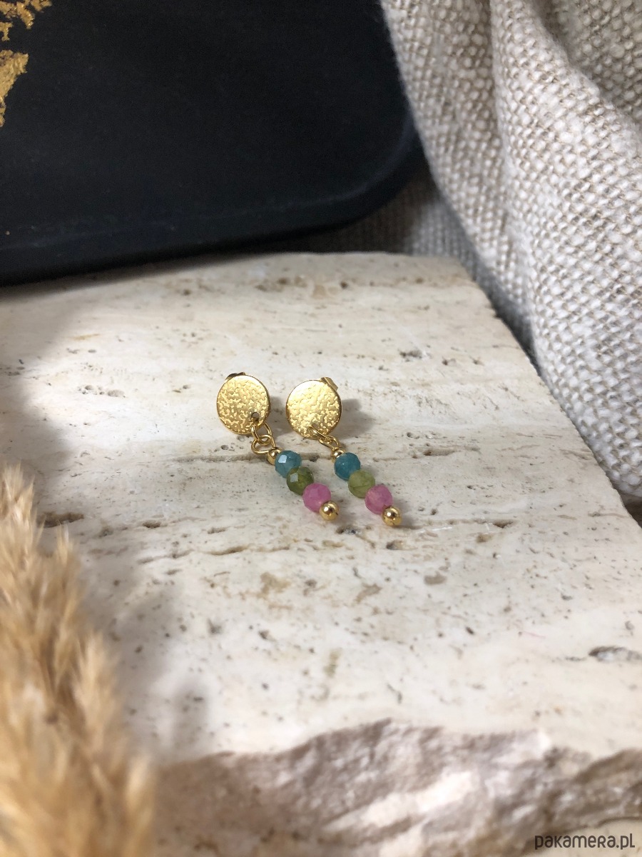Kolczyki wykonane z kamieni naturalnych i stali chirurgicznej. Na szpilkę jubilerską nawlekłam agat o średnicy 4,5 mm oraz kuleczki ze stali chirurgicznej w kolorze złotym. Baza kolczyka to kółko nakrapiane ze stali chirurgicznej w kolorze złotym 10mm. Długość całkowita kolczyków to około 3,5 cm.