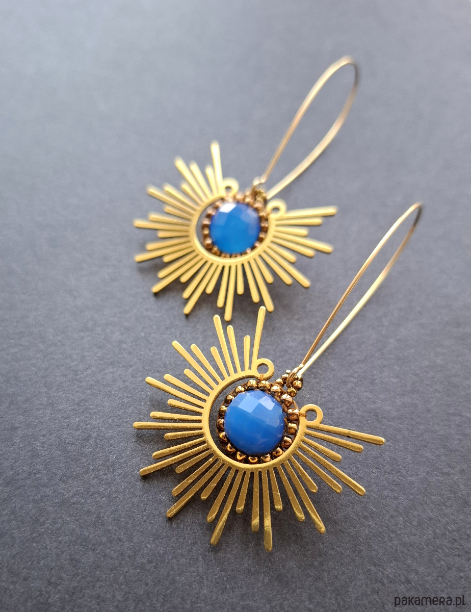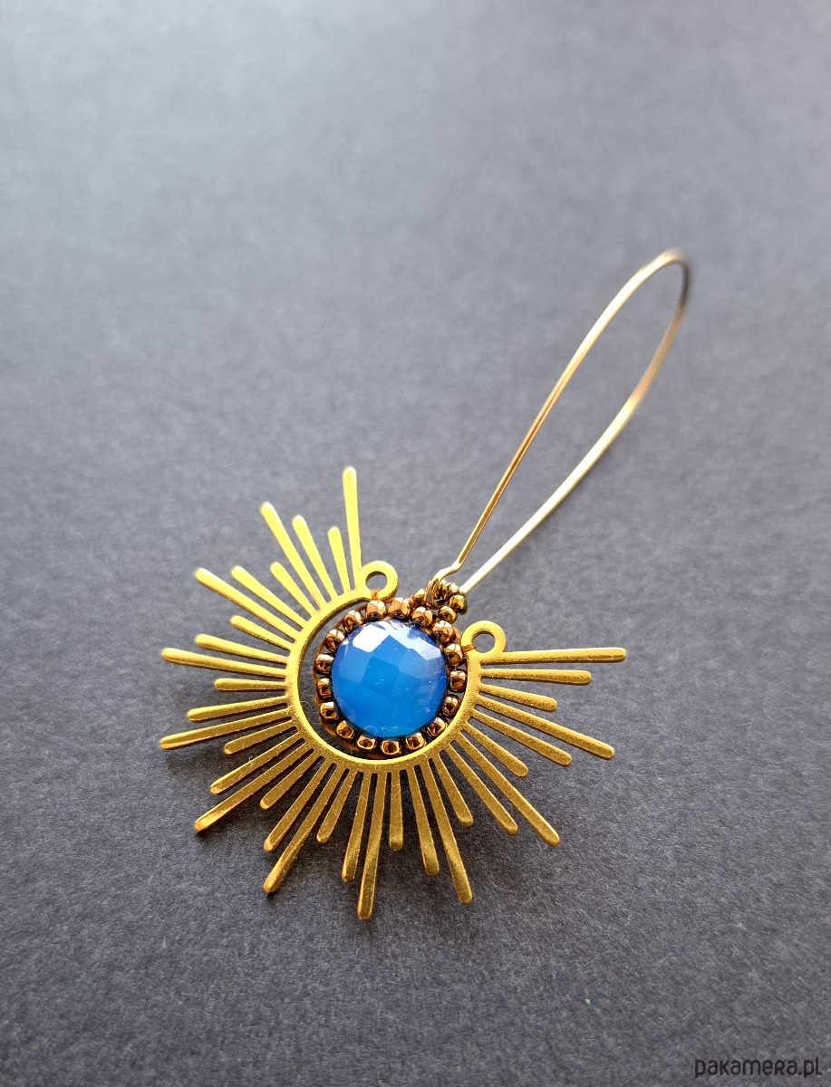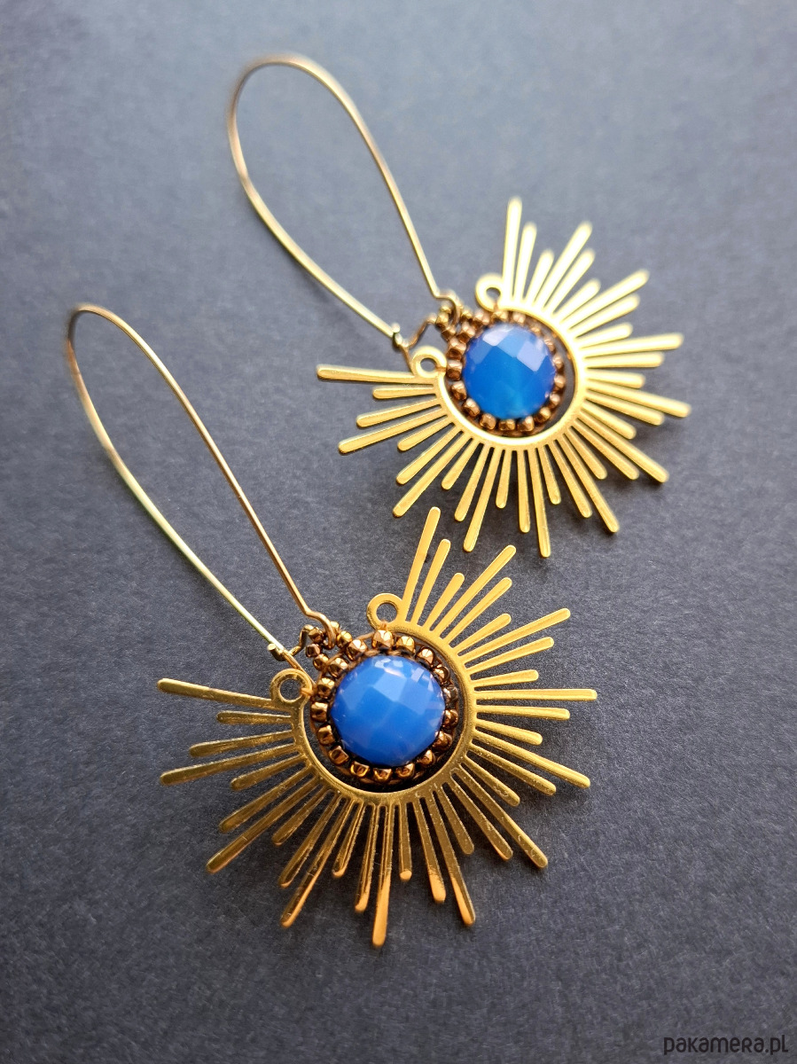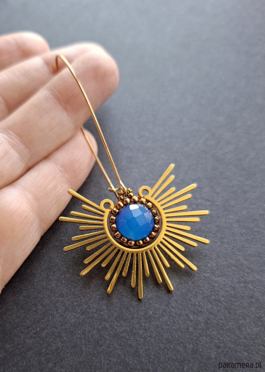 Kolczyki wiszące, wykonane z połączenia stali szlachetnej, niebieskich agatów oraz koralików szklanych. Kolczyki dwustronne, podwieszone na prostych, pozłacanych i nieuczulających biglach. Wymiary kolczyków - długość wraz z zapięciem - 7,2 cm; szerokość max. 4,2 cm. Wykonane w jedynym egzemplarzu.