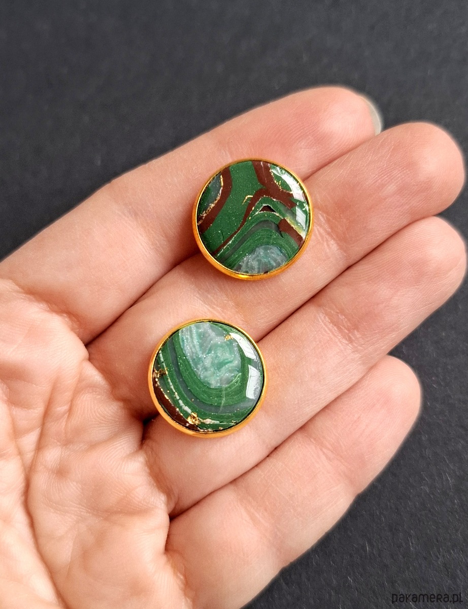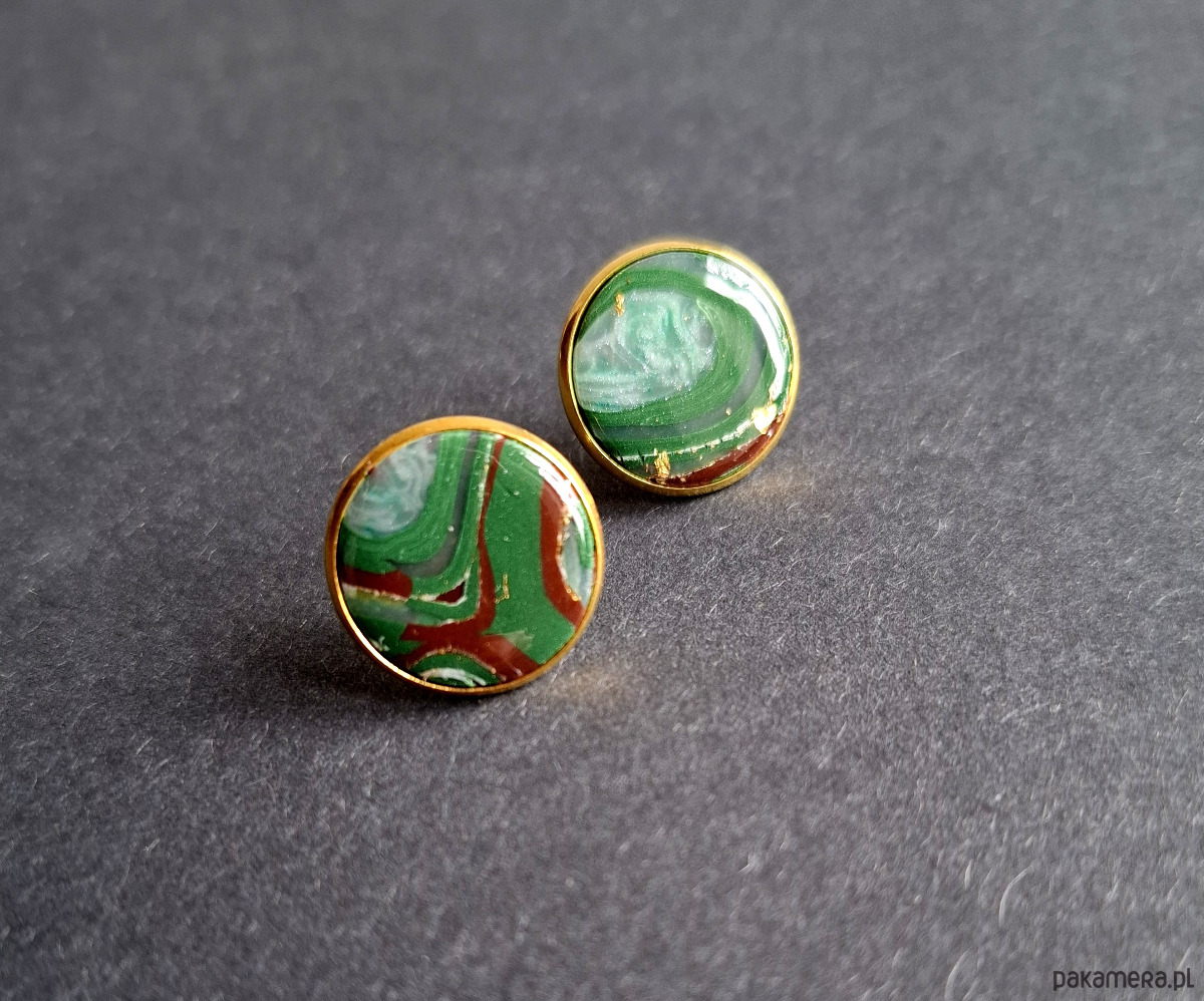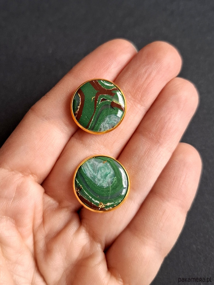Ozdobne sztyfty wykonane z wysokiej jakości glinki polimerowej. Sztyfty o bazie pozłacanej, nieuczulającej z zapięciem na klasyczne baranki. Średnica kolczyków: 1,7 cm.