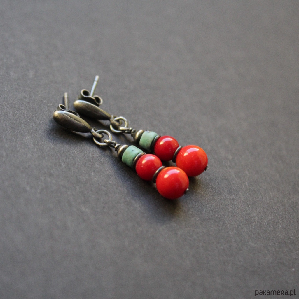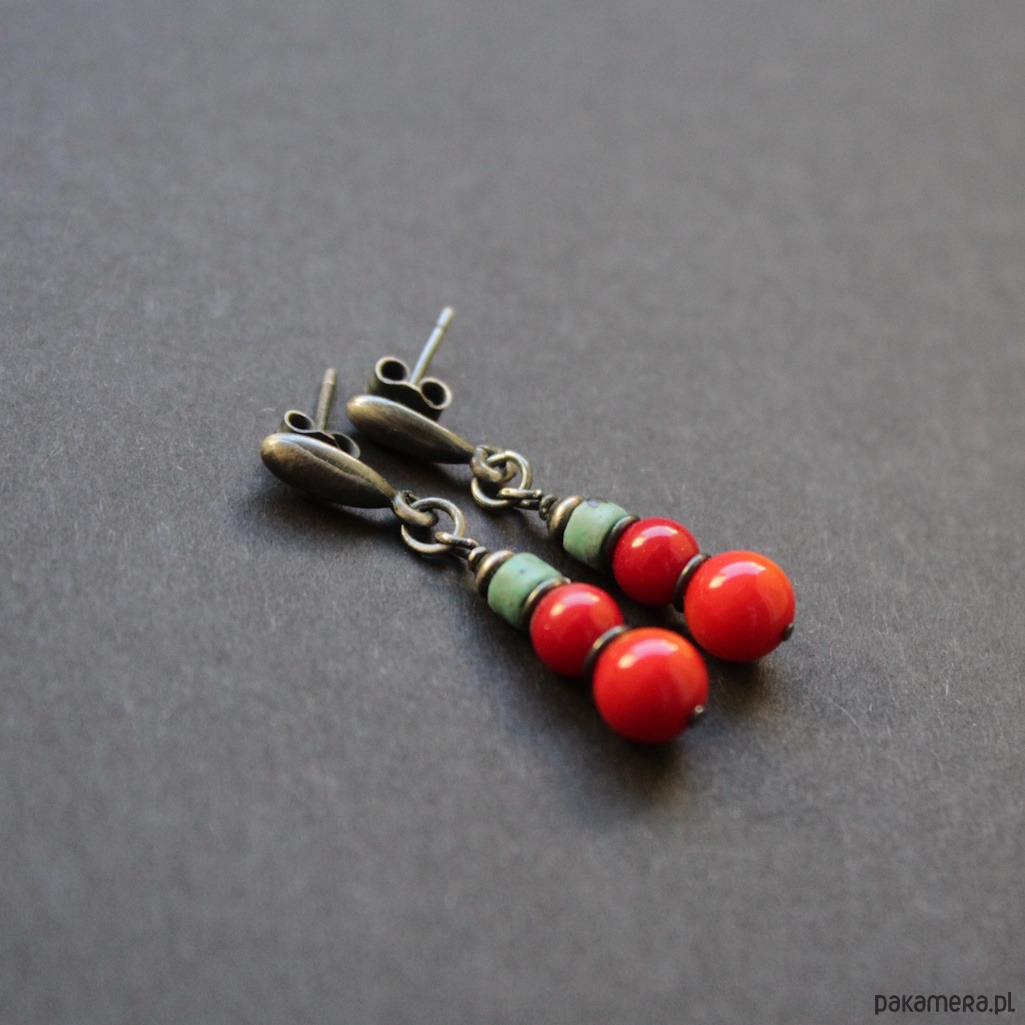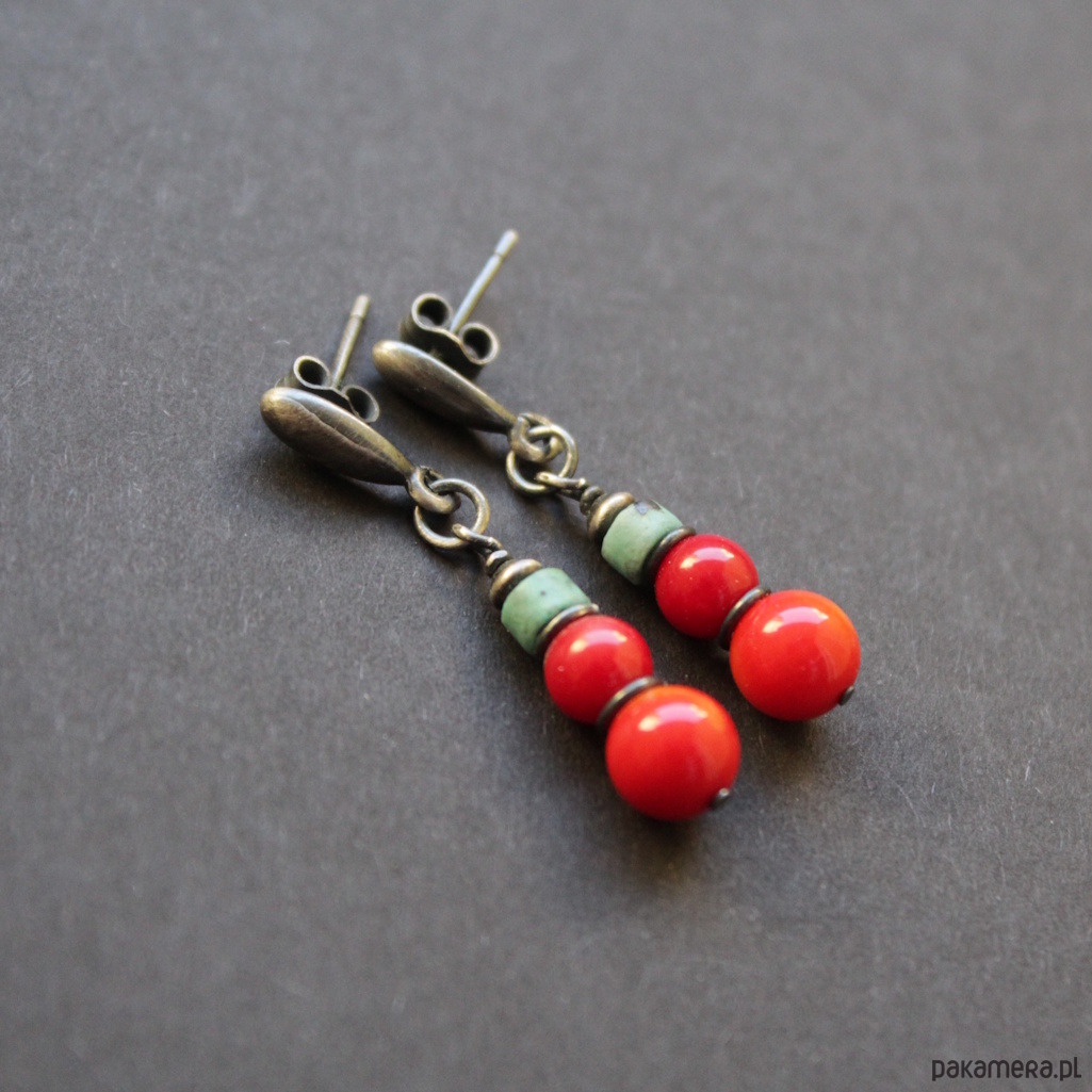 Kolorowe kolczyki wykonane zostały z oksydowanego srebra próby 925 oraz pomarańczowego korala (0,6 cm), czerwonego korala (0,4 cm), plastra turkusu (0,3 cm).