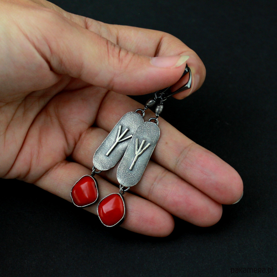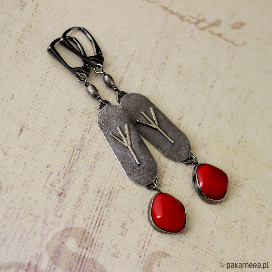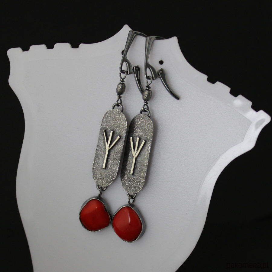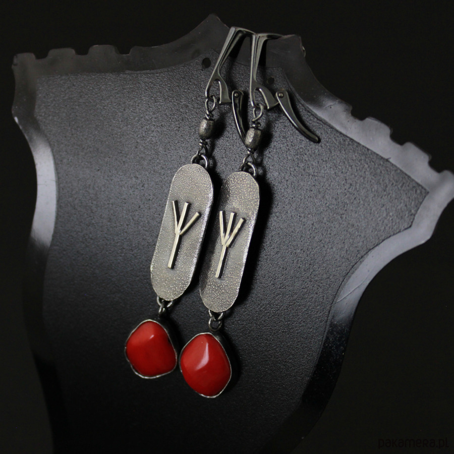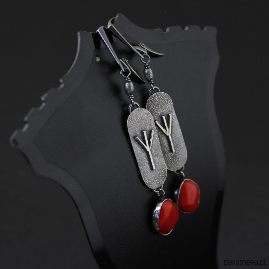 Kolczyki Algiz z czerwonym koralem - srebro oksydowane