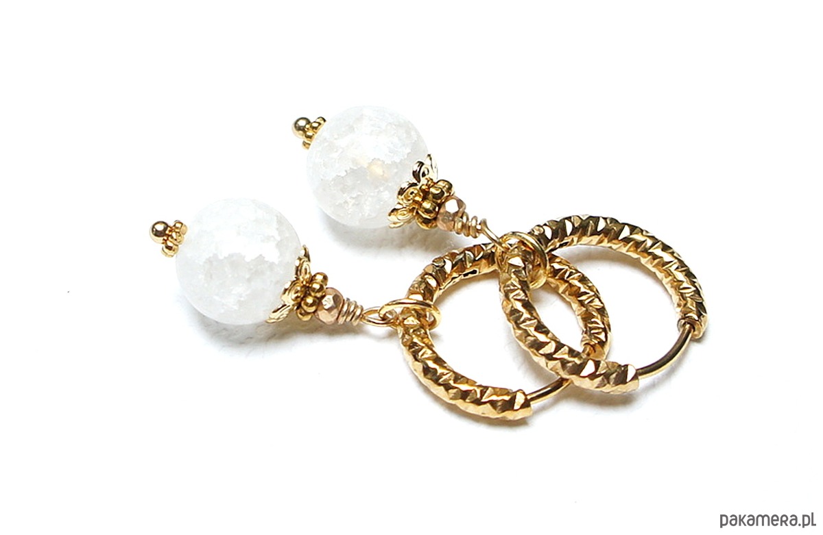 Kolczyki wykonane z naturalnych kamieni - kwarc lodowy, matowy [10mm], hematyt fasetowany, platerowany [3mm] oraz z pozłacanej stali szlachetnej. Długość kolczyków: ok. 3,8cm; średnica kół - 1,6cm. Biżuteria ozdobnie zapakowana.