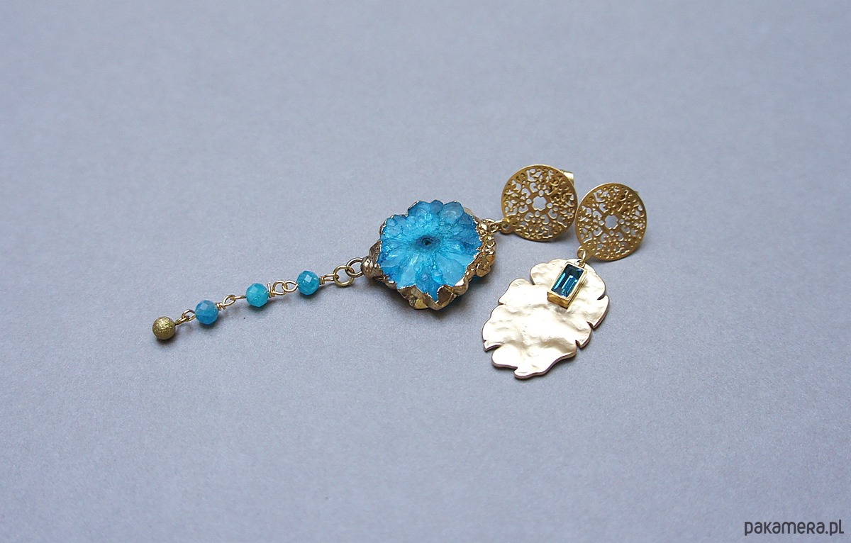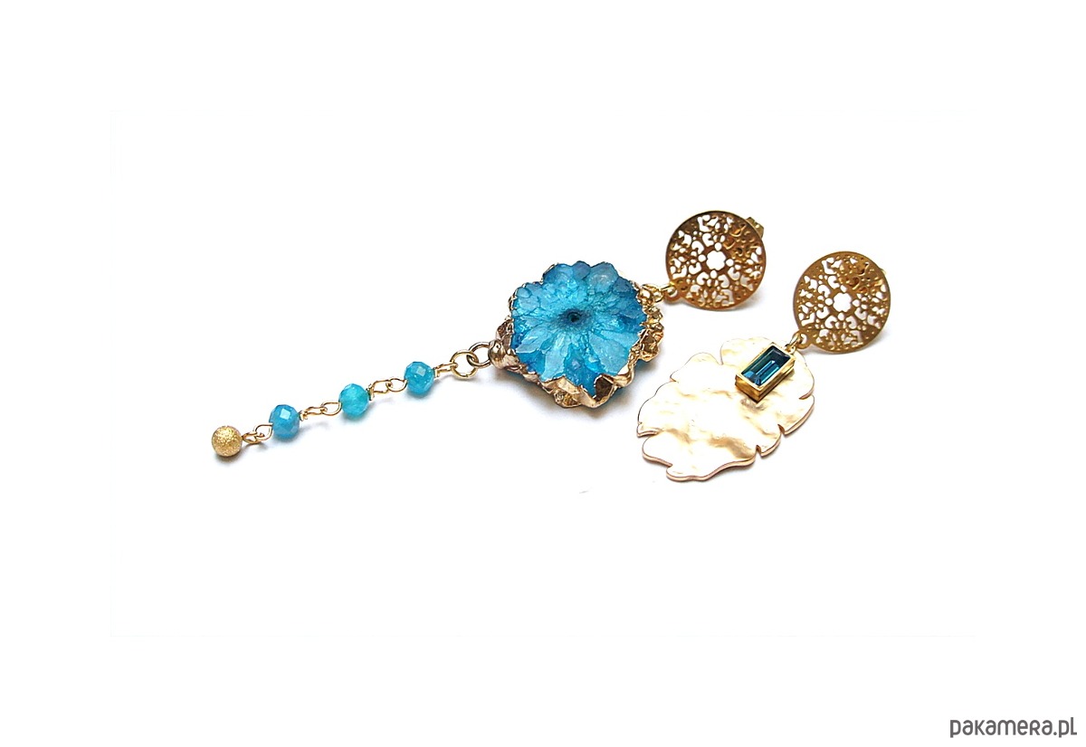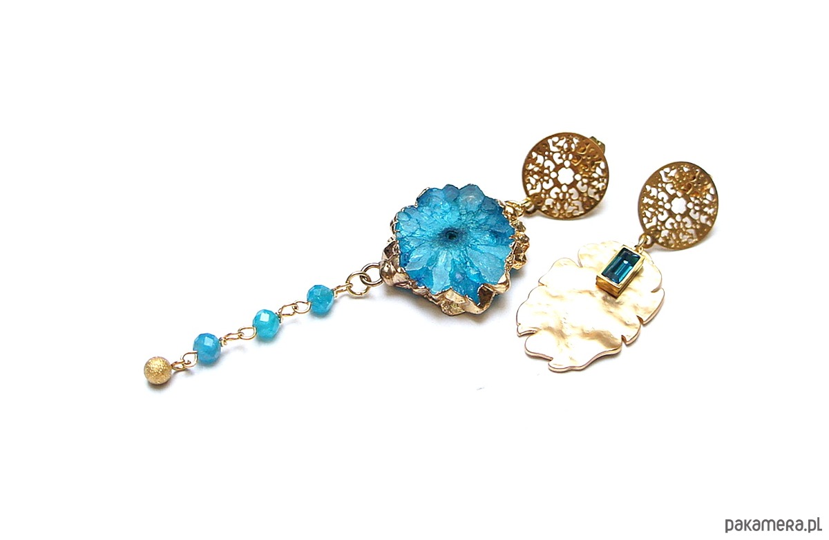 Asymetryczne kolczyki wykonane z pozłacanej stali szlachetnej, mosiądzu platerowanego, druzy agatu, apatytów fasetowanych [4mm], zawieszki z cyrkonią w okuciu. Sztyfty ze stali szlachetnej. Długość kolczyków: ok. 4,5 i 8,5cm. Biżuteria ozdobnie zapakowana.
