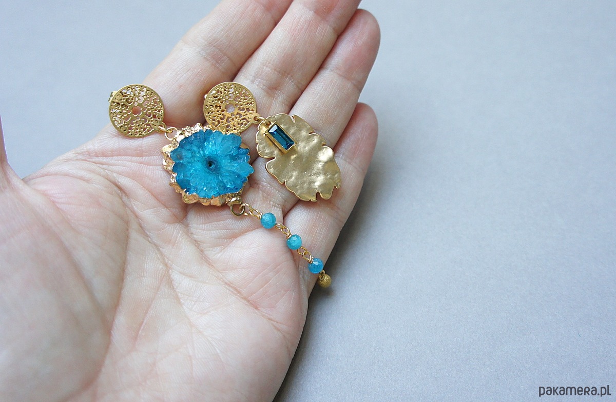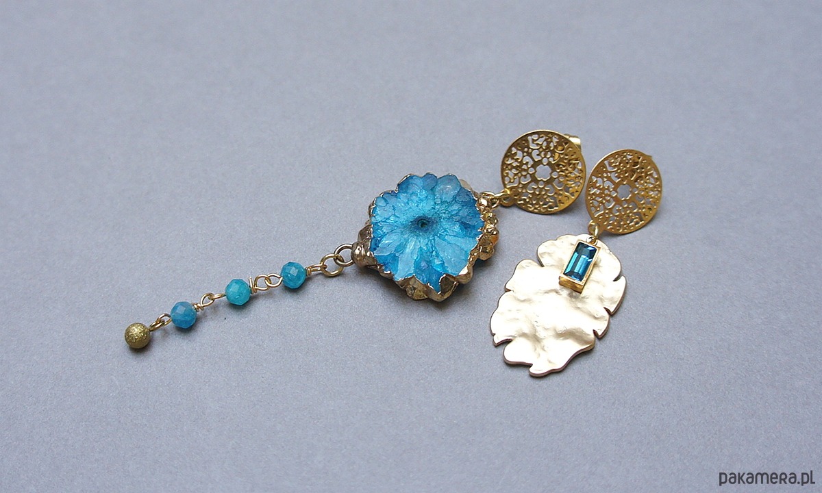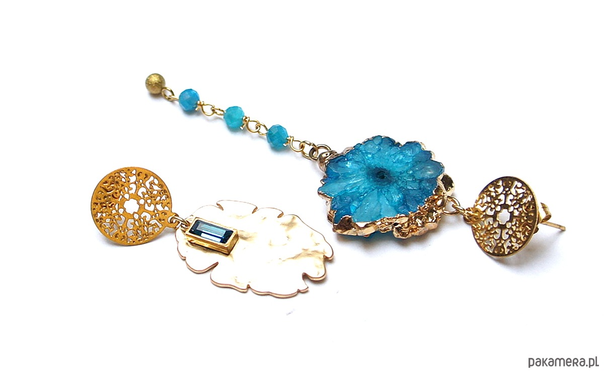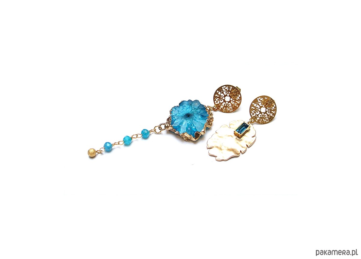 Asymetryczne kolczyki wykonane z pozłacanej stali szlachetnej, mosiądzu platerowanego, druzy agatu, apatytów fasetowanych [4mm], zawieszki z cyrkonią w okuciu. Sztyfty ze stali szlachetnej. Długość kolczyków: ok. 4,5 i 8,5cm. Biżuteria ozdobnie zapakowana.
