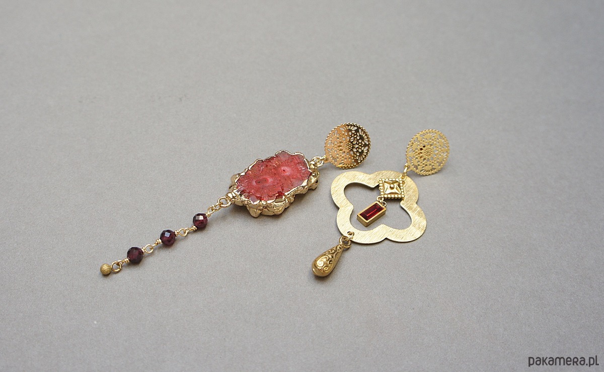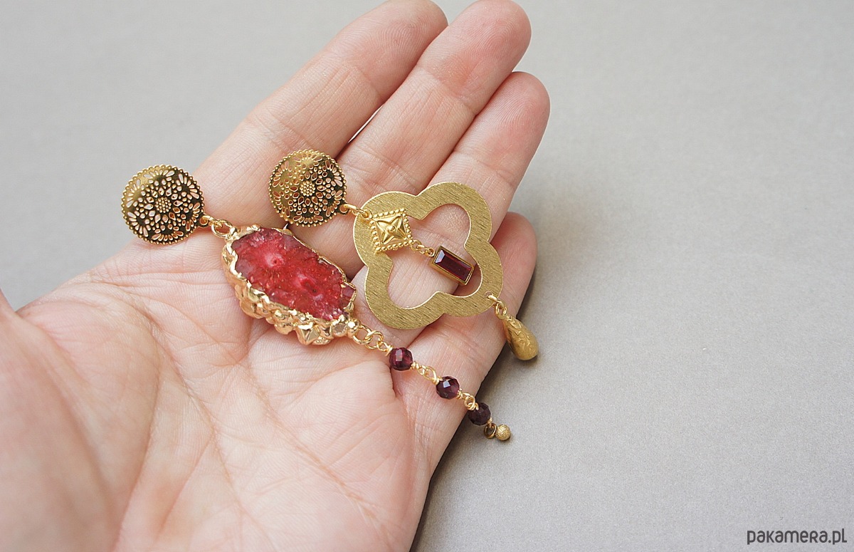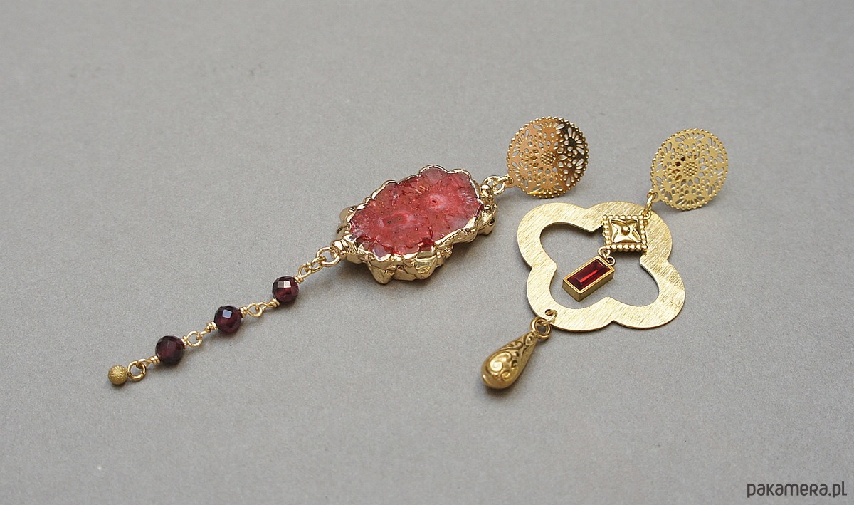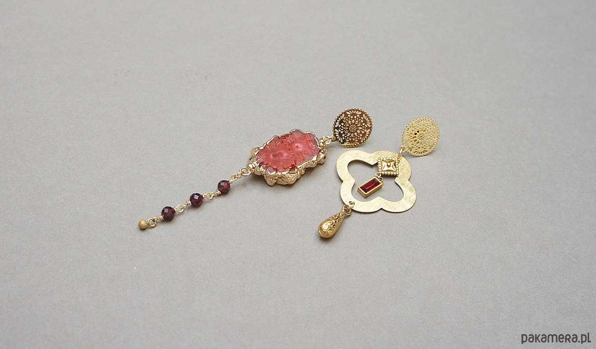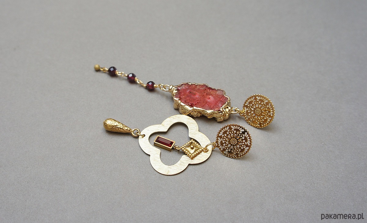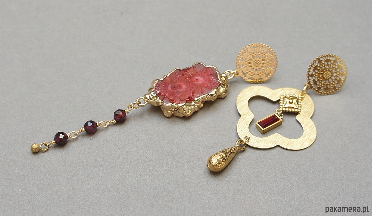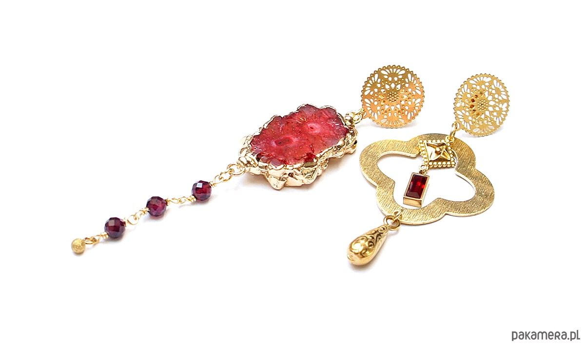 Asymetryczne kolczyki wykonane z pozłacanej stali szlachetnej, druzy agatu, fasetowanych kuleczek granatów [4mm], koniczynki marokańskiej z mosiądzu [30mm], zawieszki z cyrkonią w okuciu. Sztyfty ze stali szlachetnej. Długość kolczyków: ok.6,6cm i 9cm. Biżuteria ozdobnie zapakowana.
