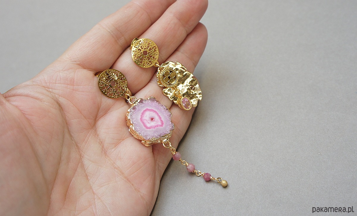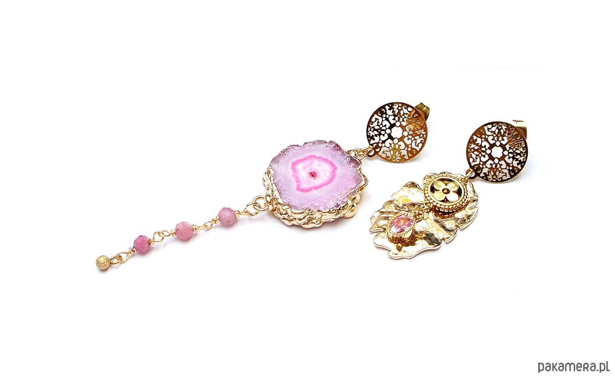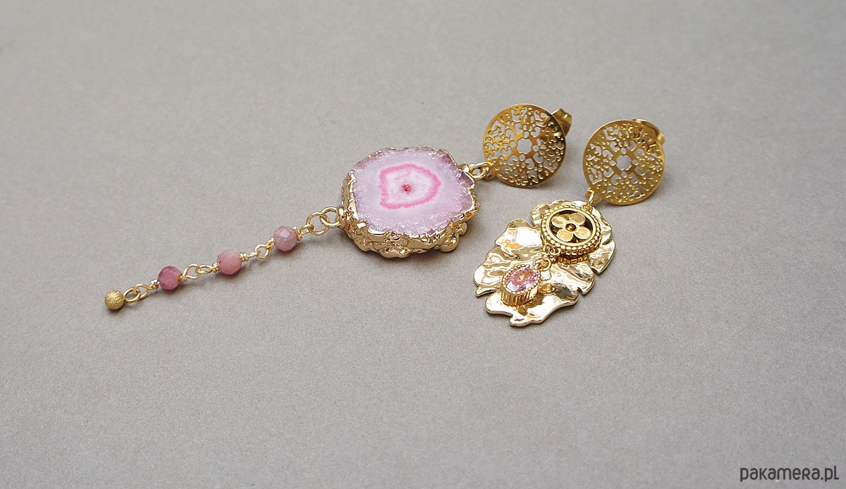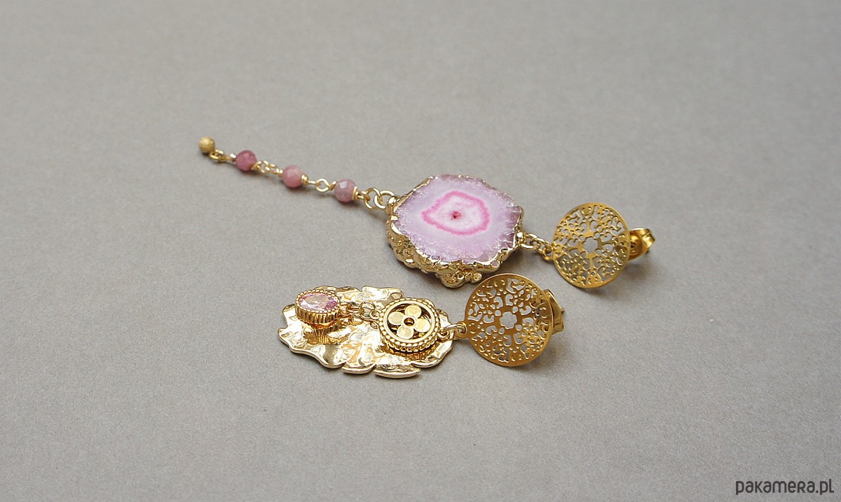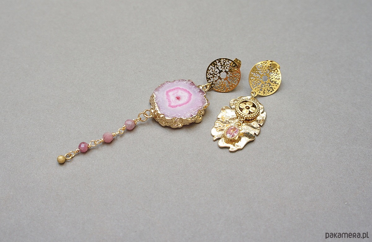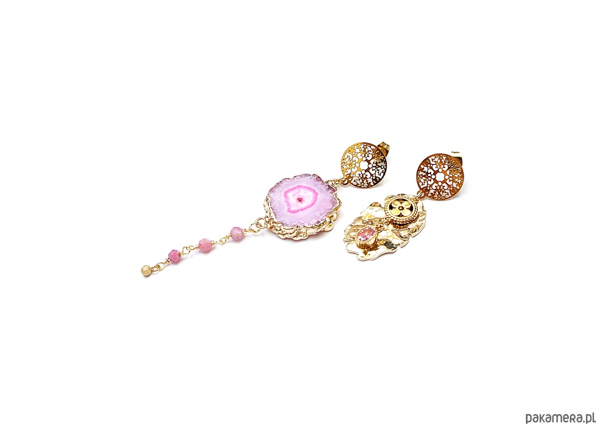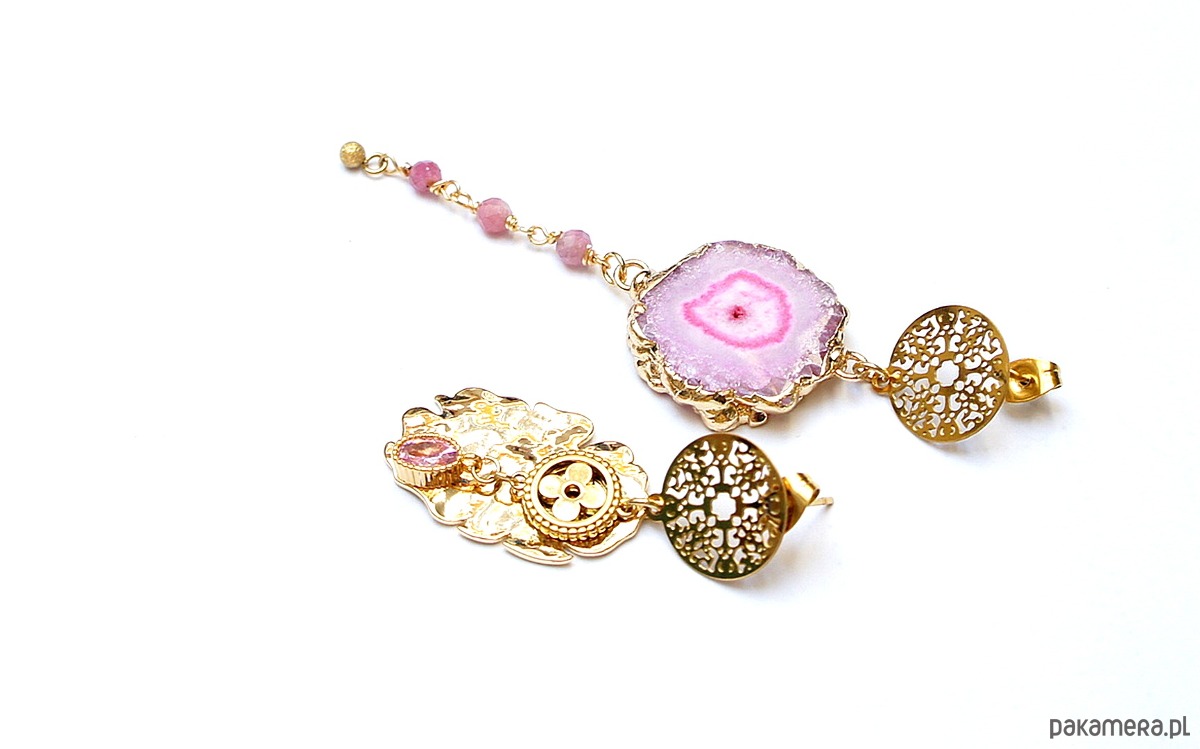 Asymetryczne kolczyki wykonane z pozłacanej stali szlachetnej, druzy agatu, fasetowanych kuleczek różowego turmalinu [4mm], nieregularnej blaszki z platerowanego mosiądzu, zawieszki z cyrkonią w okuciu. Sztyfty ze stali szlachetnej. Długość kolczyków: ok.4,4cm i 8,2cm. Biżuteria ozdobnie zapakowana.