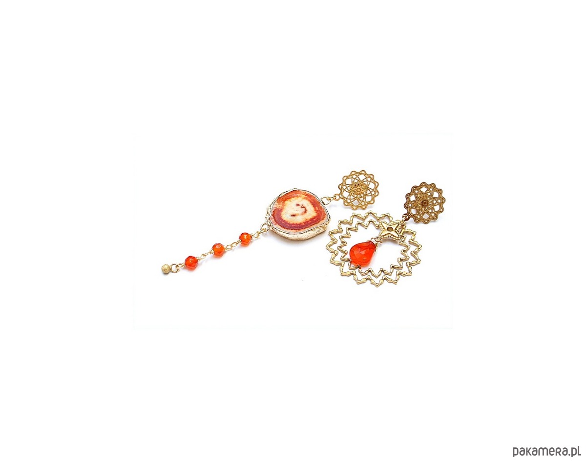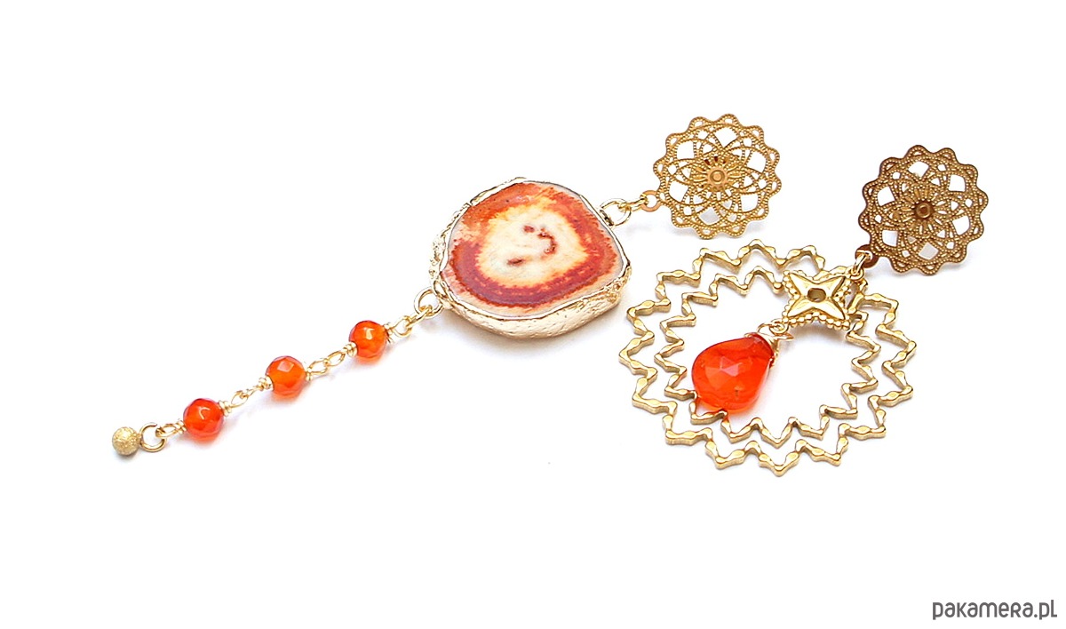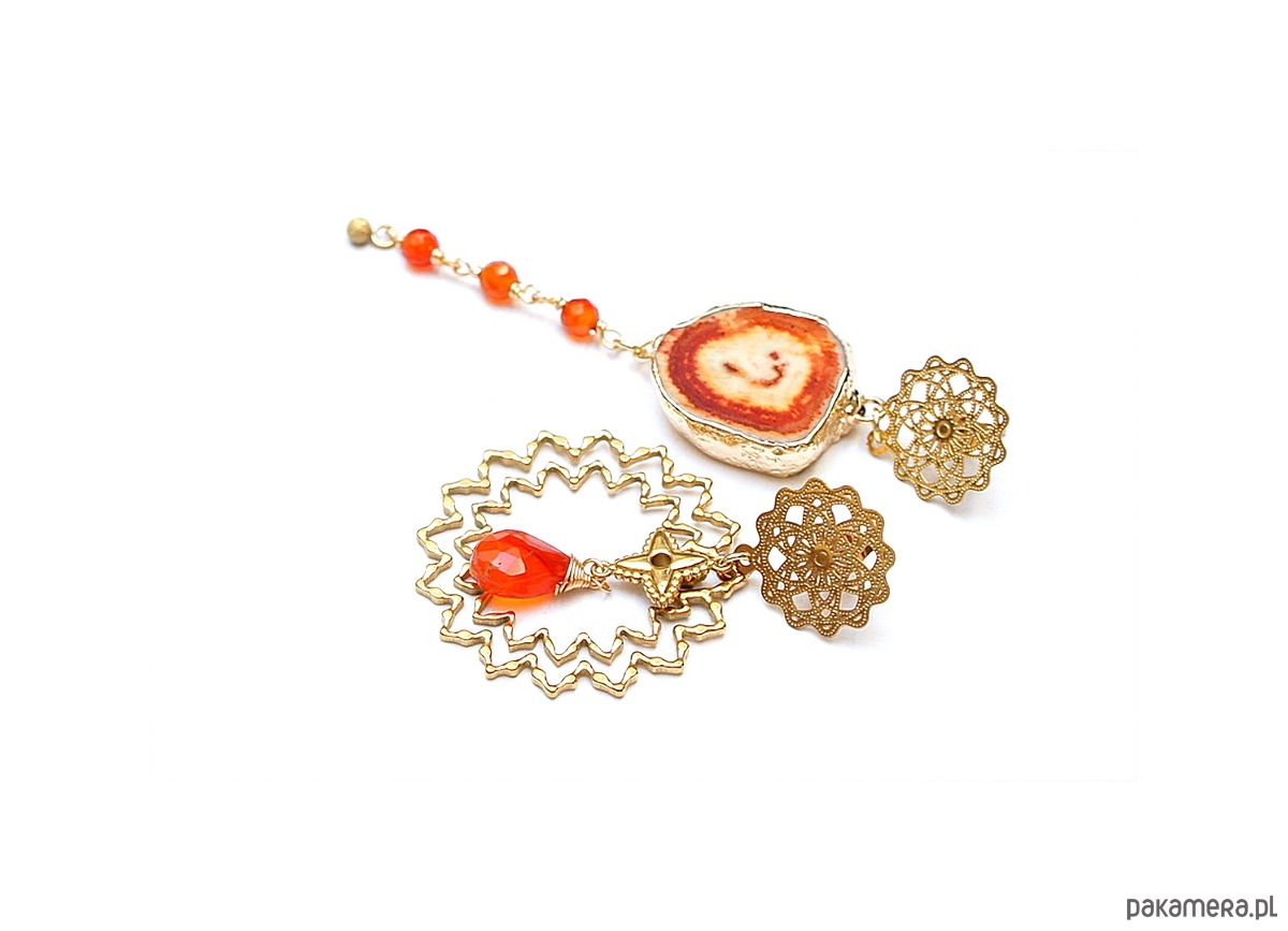 Asymetryczne kolczyki wykonane z pozłacanej stali szlachetnej, druzy agatu, fasetowanych kuleczek zielonego karneolu [4mm], dużego, ażurowego elementu z mosiądzu [32mm], brioletki karneol [ok. 11mm]. Sztyfty ze stali szlachetnej. Długość kolczyków: ok. 5cm i 8,4cm. Biżuteria ozdobnie zapakowana.