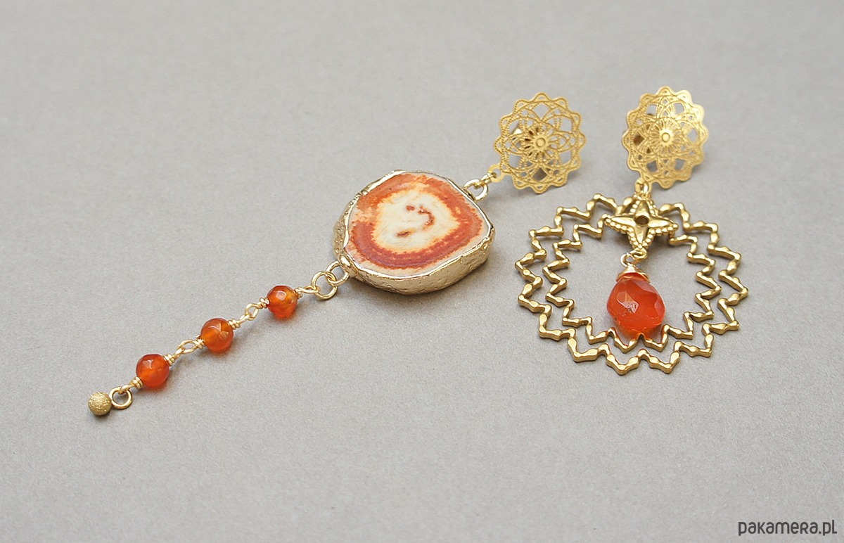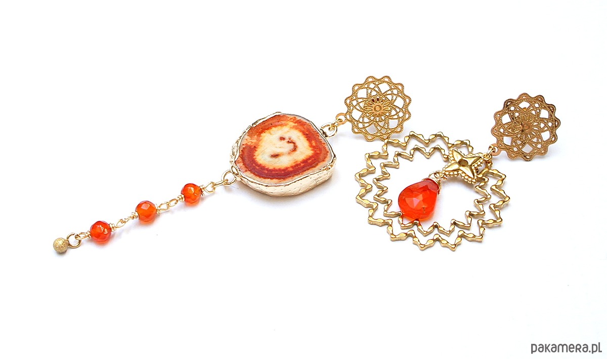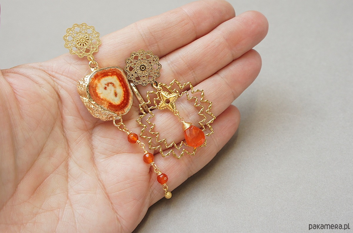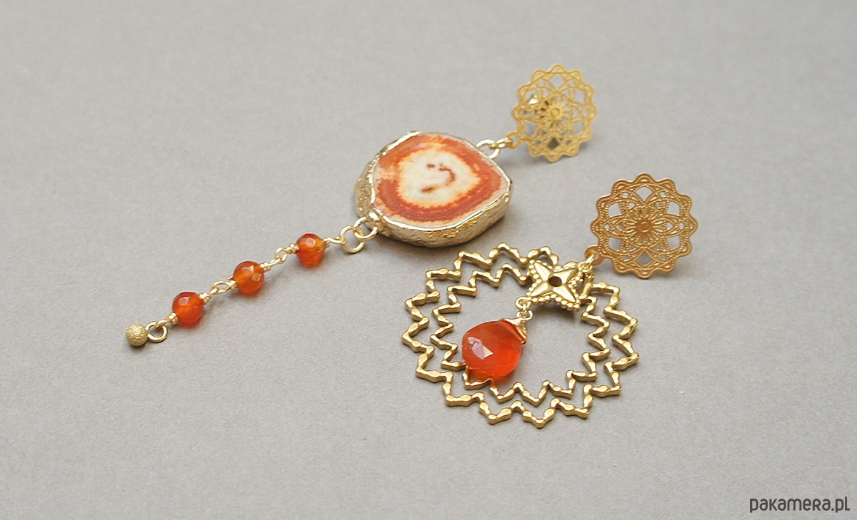 Asymetryczne kolczyki wykonane z pozłacanej stali szlachetnej, druzy agatu, fasetowanych kuleczek zielonego karneolu [4mm], dużego, ażurowego elementu z mosiądzu [32mm], brioletki karneol [ok. 11mm]. Sztyfty ze stali szlachetnej. Długość kolczyków: ok. 5cm i 8,4cm. Biżuteria ozdobnie zapakowana.