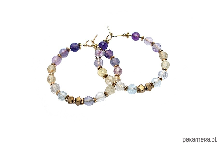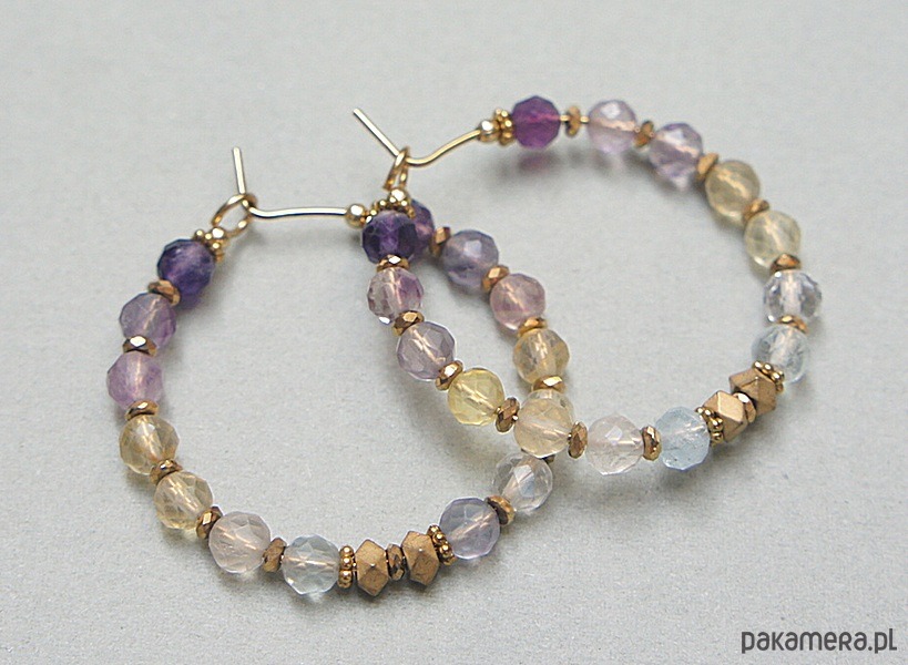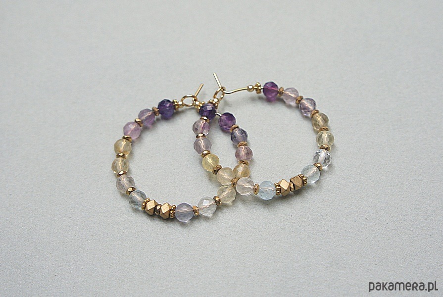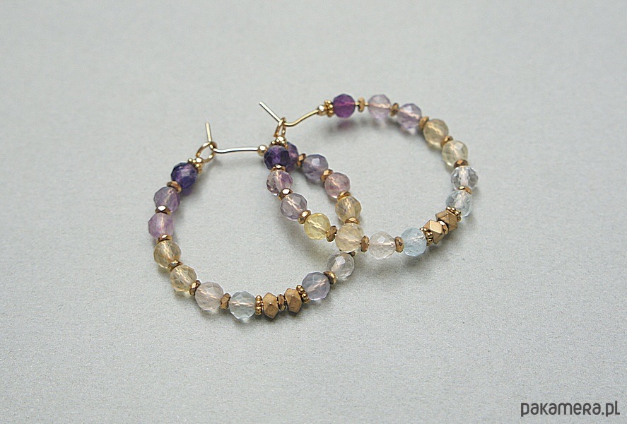 Kolczyki wykonane ze stali szlachetnej pokrytej zlotem, fluorytu fasetowanego [3mm], przekładek z hematytu [1mm oraz 3 x 2mm]. Średnica kół 30mm. Biżuteria ozdobnie zapakowana.