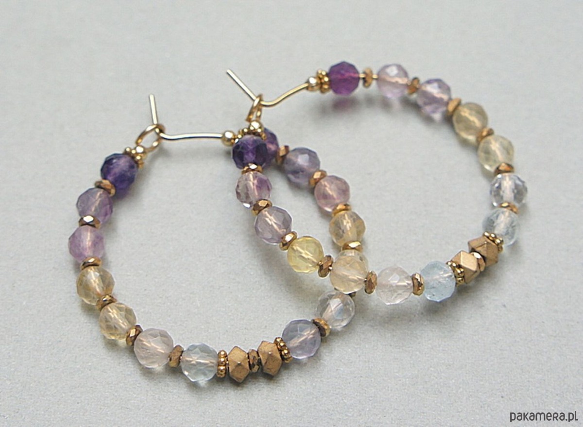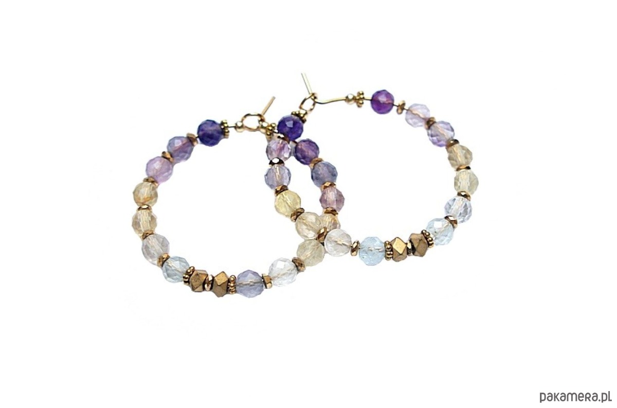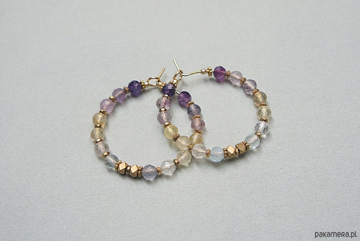 Kolczyki wykonane ze stali szlachetnej pokrytej zlotem, fluorytu fasetowanego [3mm], przekładek z hematytu [1mm oraz 3 x 2mm]. Średnica kół 30mm. Biżuteria ozdobnie zapakowana.