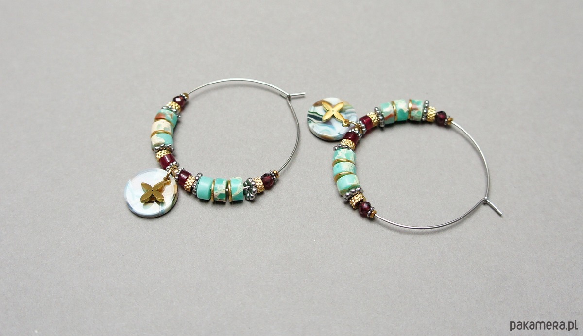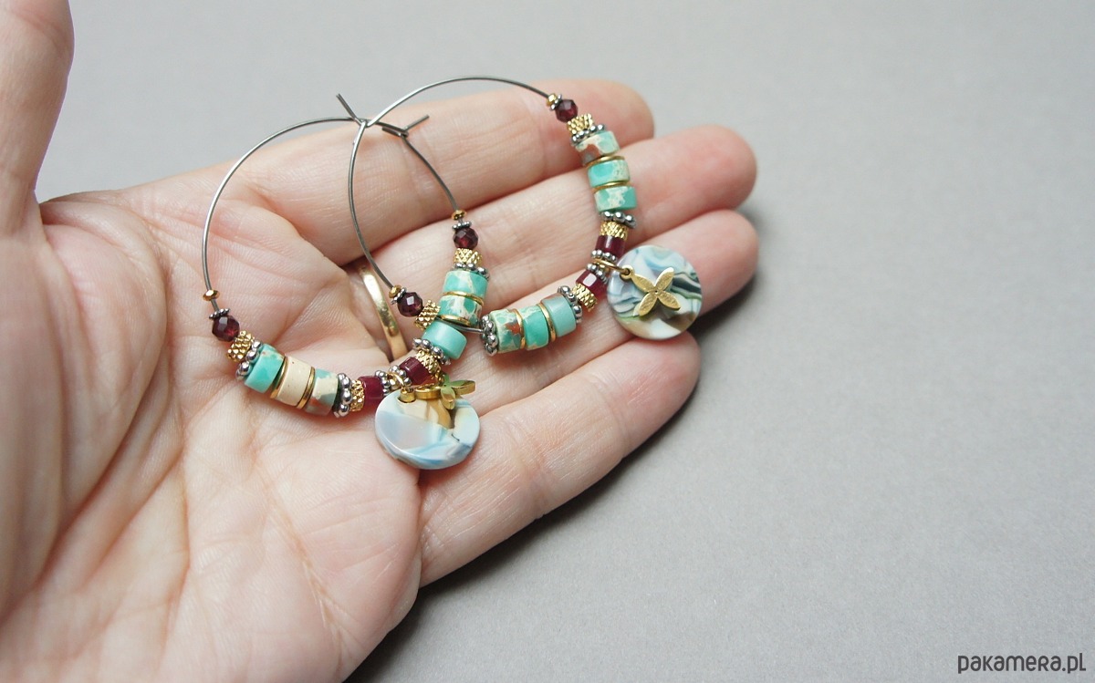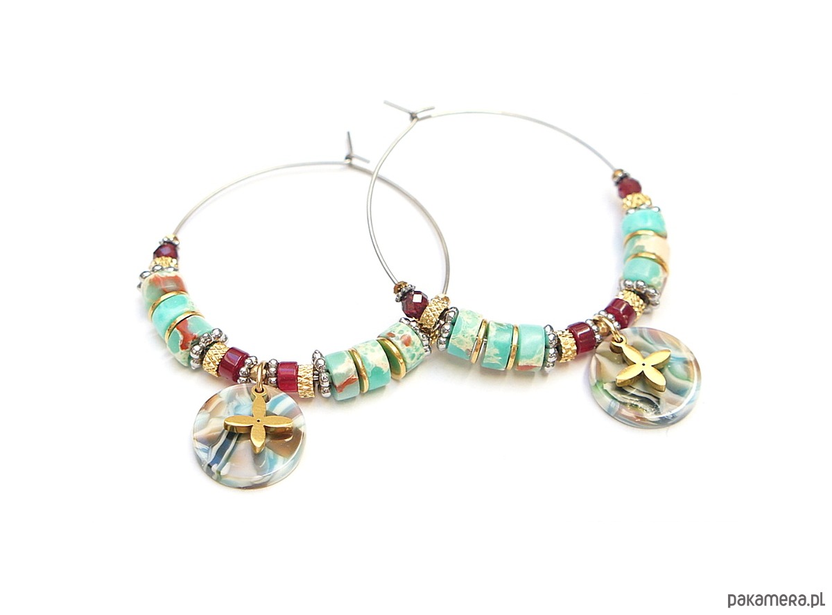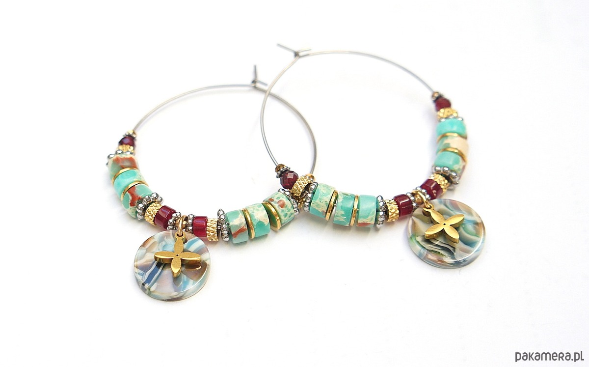 Kolczyki wykonane ze stali szlachetnej, stali szlachetnej pozłacanej, talarków jaspisów [6 x 2mm], talarków jadeitów [4 x 2mm], granatów fasetowanych [3mm], hematytów [1mm i 2mm] oraz zawieszki z żywicy [14mm]. Średnica kół 40mm. Biżuteria ozdobnie zapakowana.