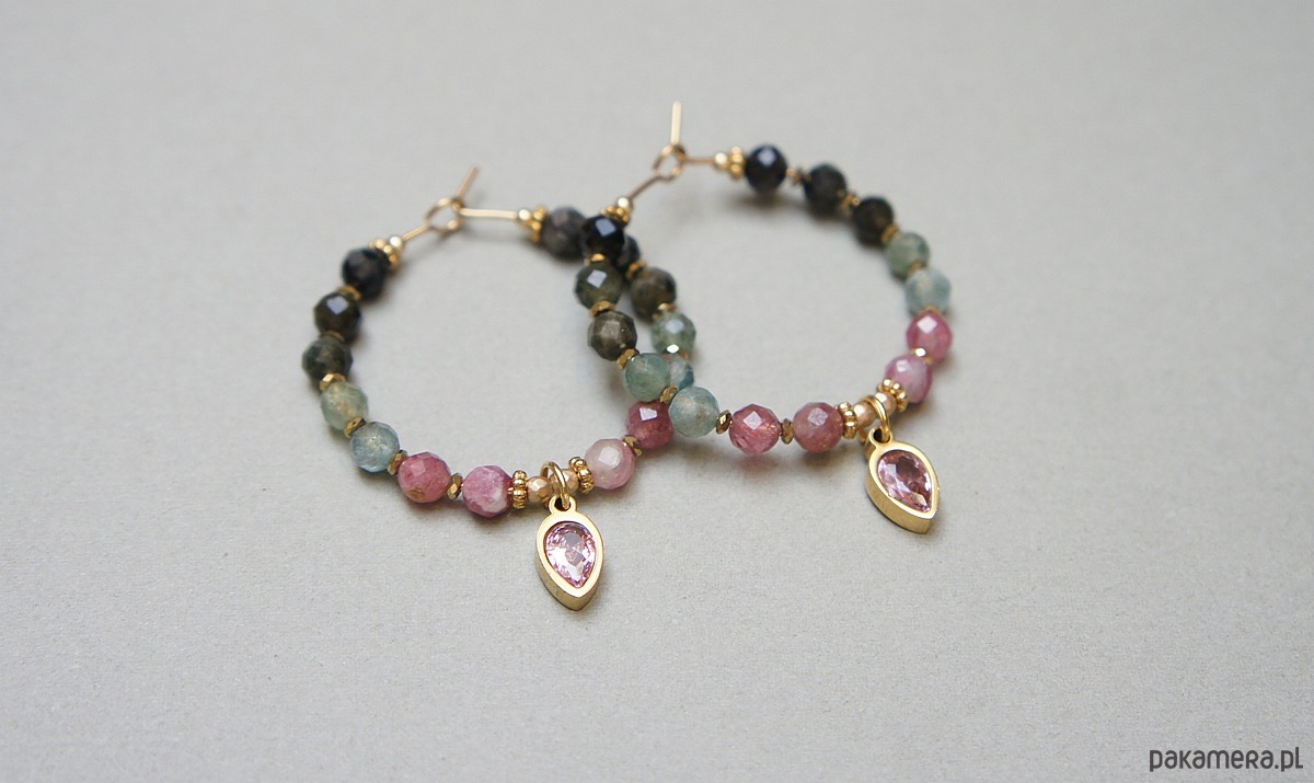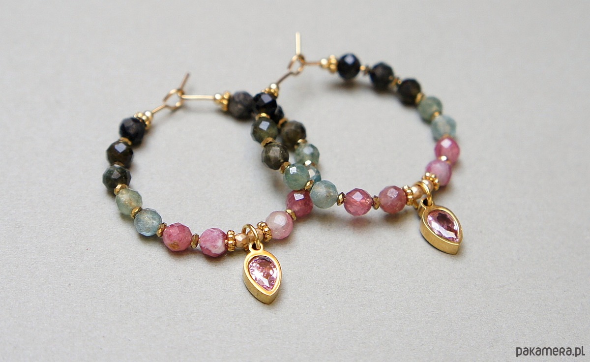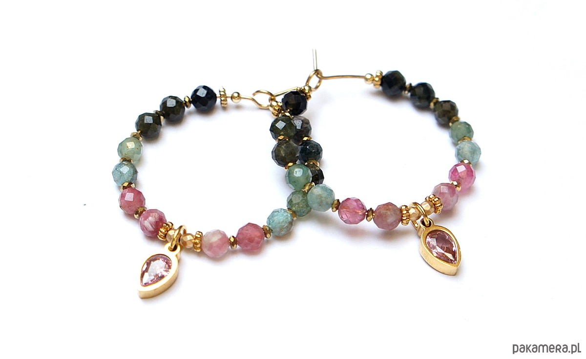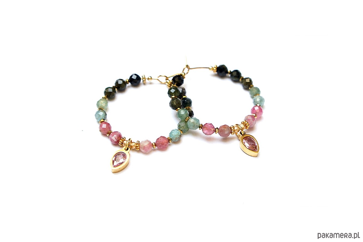 Kolczyki wykonane ze stali szlachetnej pokrytej zlotem, kamieni naturalnych: turmalinów fasetowanych [4mm], przekładek z hematytu [1mm] oraz zawieszek z cyrkoniami w okuciu. Średnica kół 30mm. Biżuteria ozdobnie zapakowana.