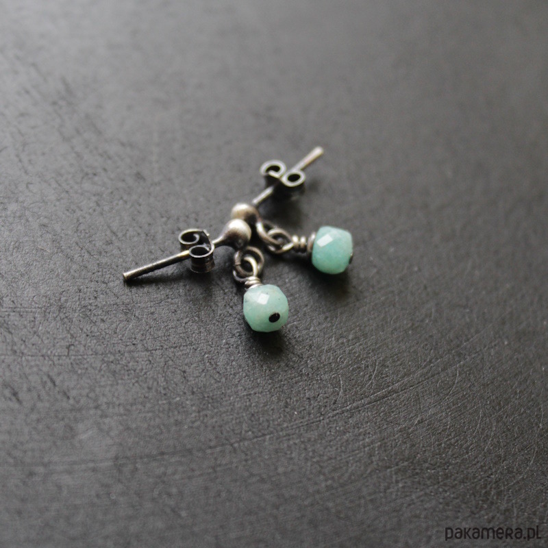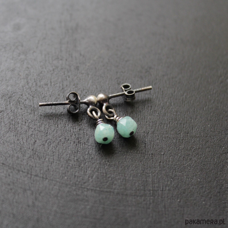 Minimalistyczne kolczyki wykonane zostały z oksydowanego srebra 925 oraz oraz kosteczek amazonitu wielkości 0,45 cm.