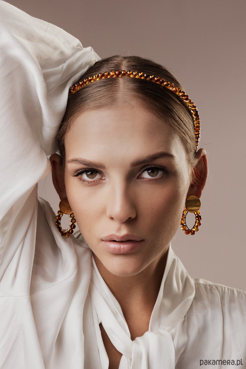 Górny geometryczny element w złotym odcieniu nadaje mi charakteru vintage, a bursztyny