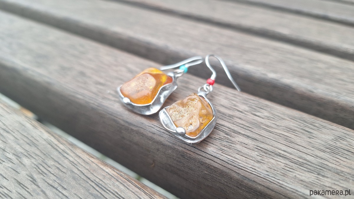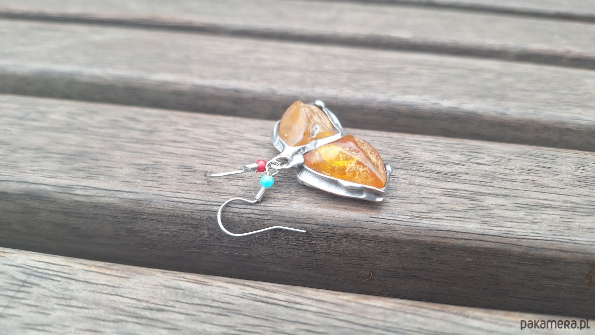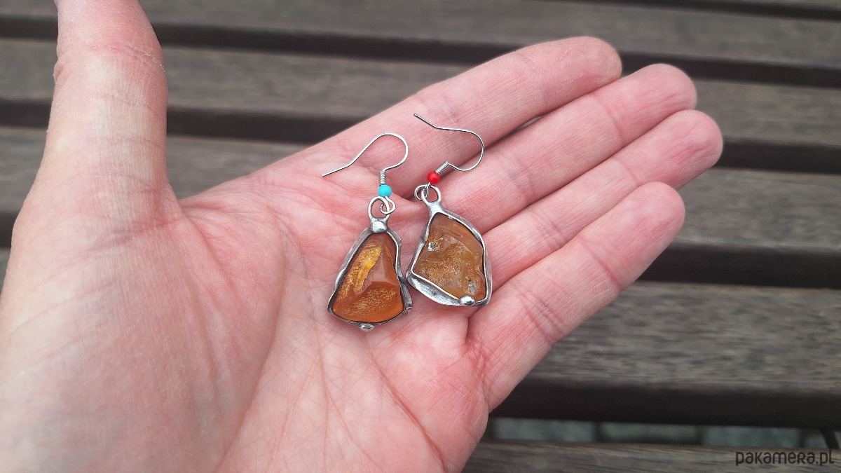 Kolczyki wykonane z miedzi, cyny i bursztynów. Długość ok. 4.5 cm z biglem, szerokość ok. 1.5 cm. Kolczyki nie są idealnie równe. Bigle metalowe.