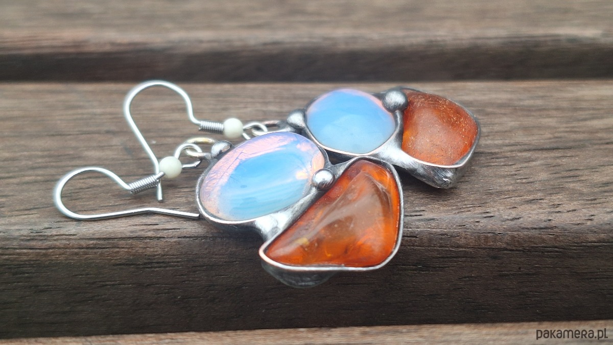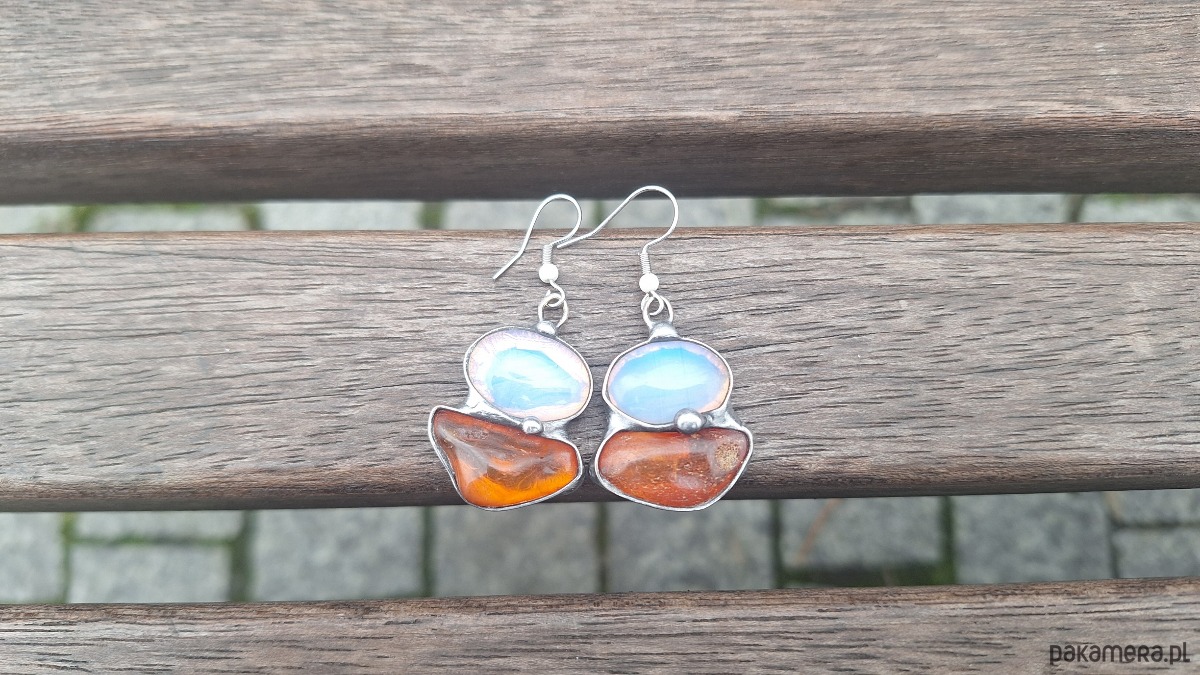 Kolczyki wykonane z miedzi, cyny, opalitów i bursztynów. Długość ok. 5 cm z biglem, szerokość ok. 2 cm. Kolczyki nie są idealnie równe. Bigle metalowe.