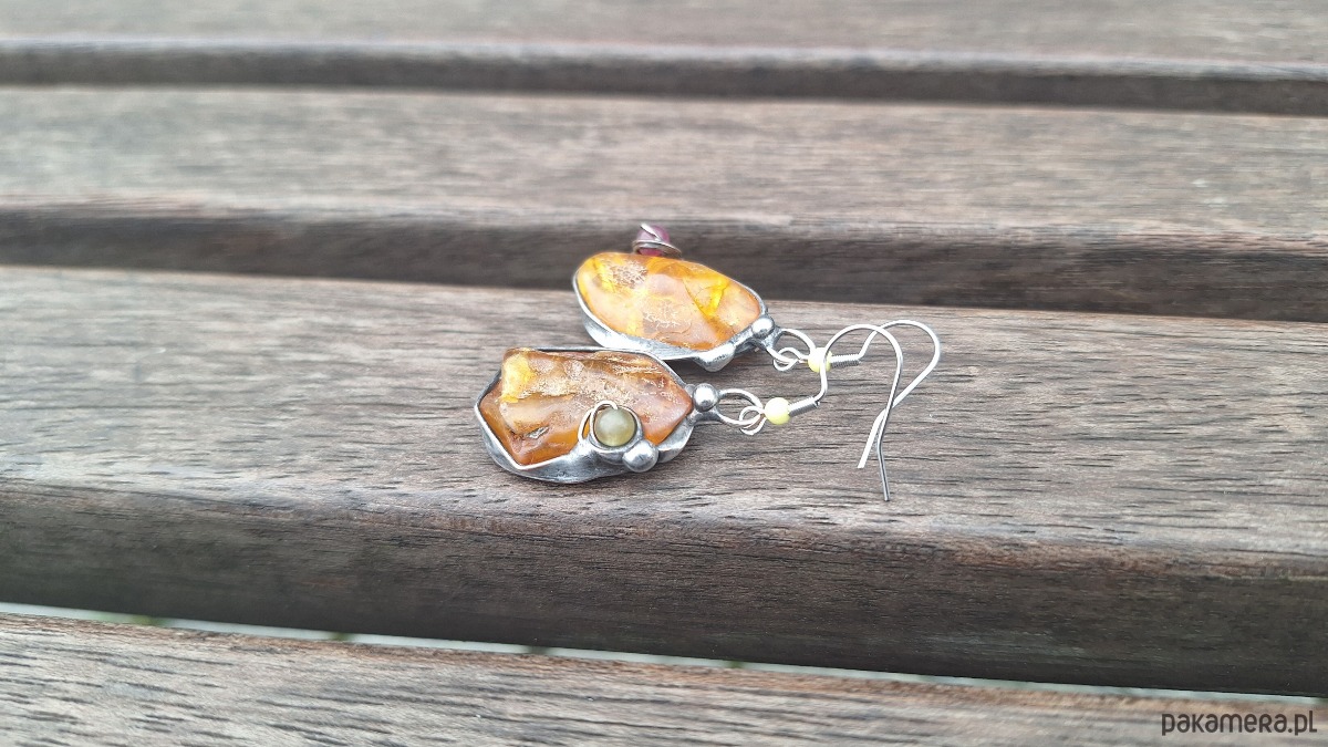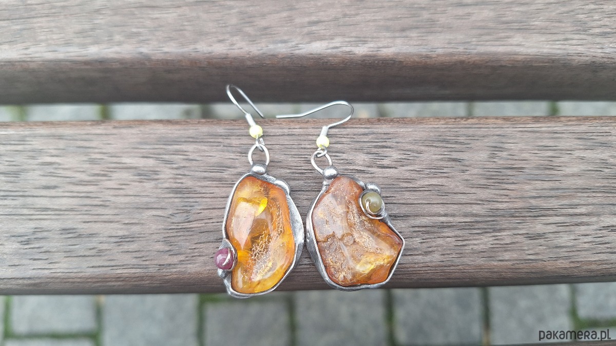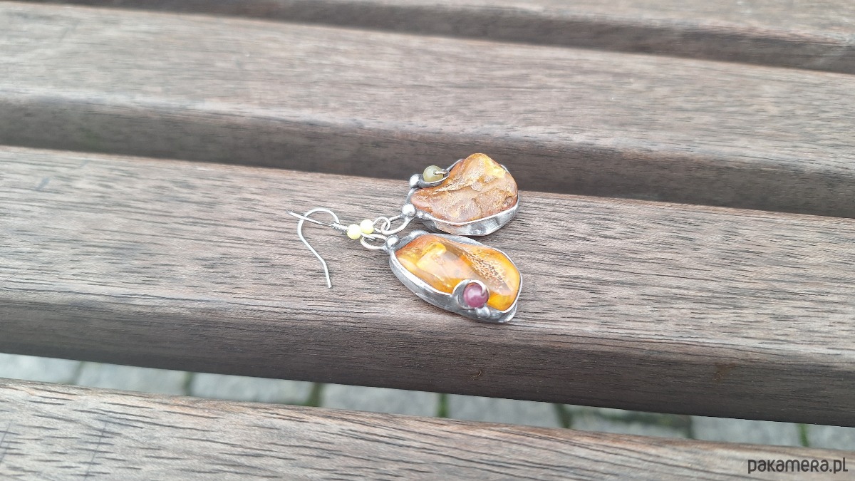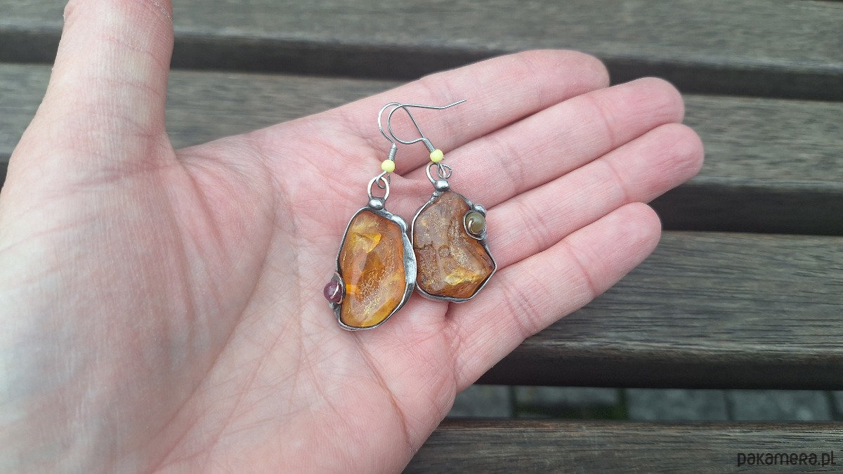 Kolczyki wykonane z miedzi, cyny, turmalinów i bursztynów. Długość ok. 5 cm z biglem, szerokość ok. 1.7 cm. Kolczyki nie są idealnie równe. Bigle metalowe.