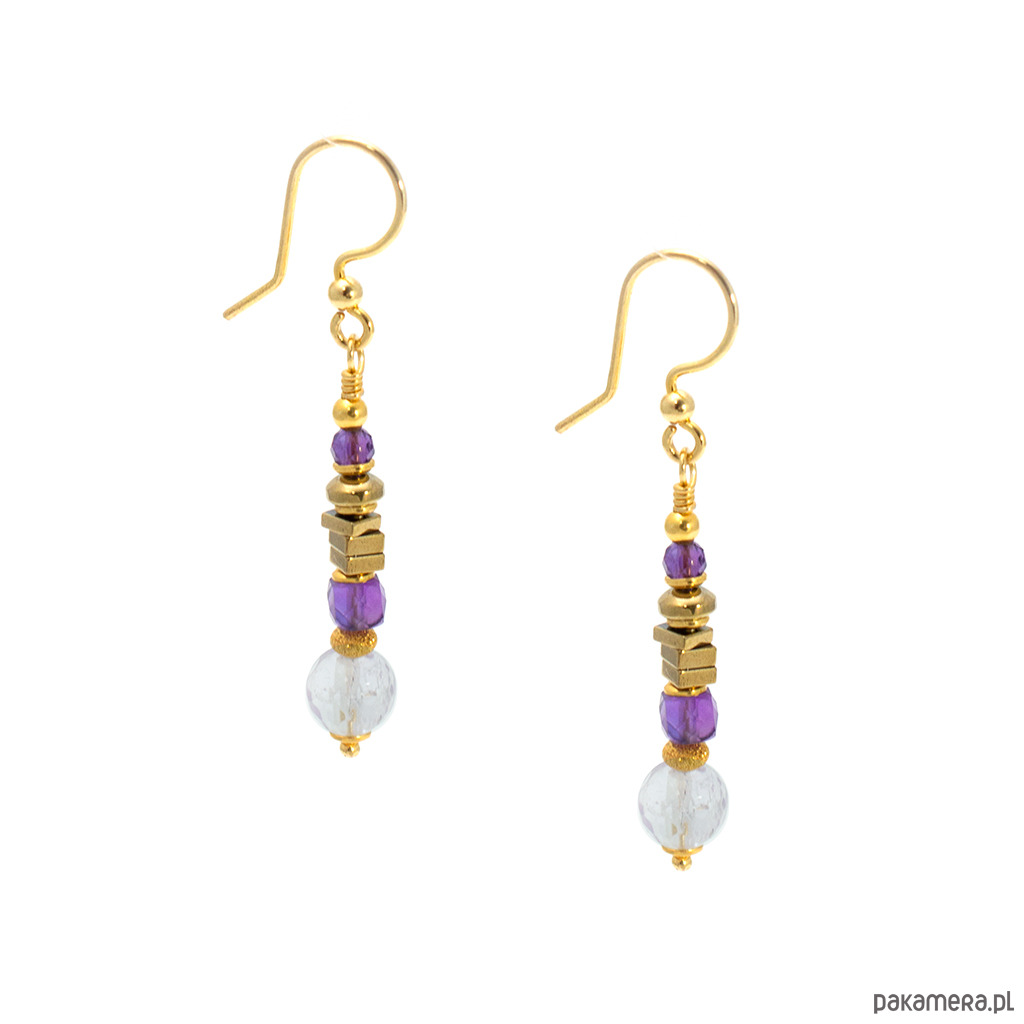 Delikatne kolczyki z ametystami i złoconymi hematytami. Kamienie w rozmiarze od 2 do 5mm. Wykonane w całości ze srebra próby 925 pozłacanego 24-karatowym złotem. Długość całkowita z biglami: 4,5cm. W ozdobnym, firmowym opakowaniu.