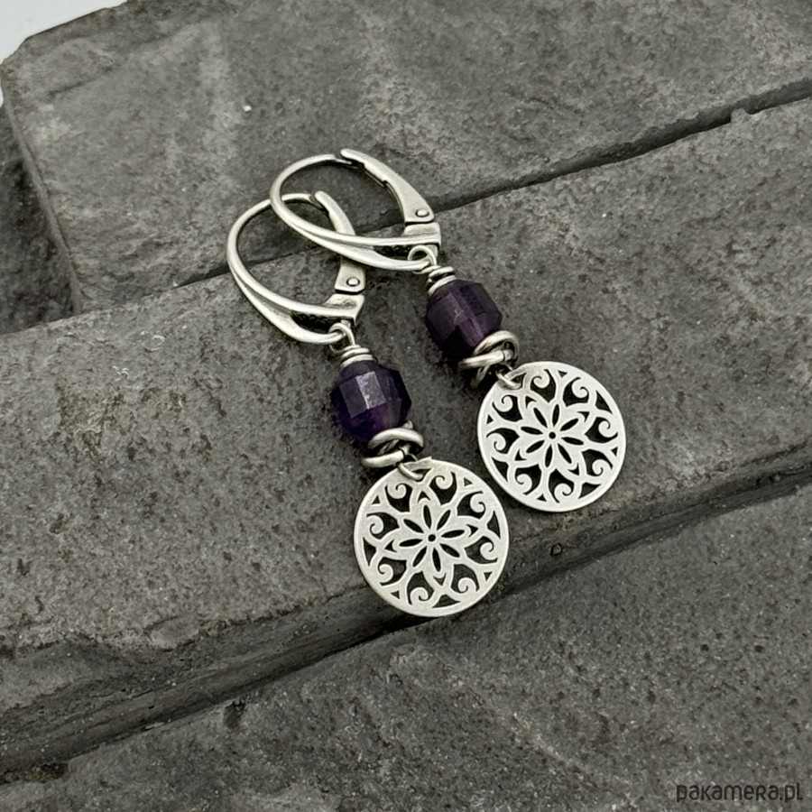 Minimalistyczne, subtelne i oryginalne kolczyki na co dzień. Wykonane w całości ze srebra próby 925 oraz fasetowanych bryłek ametystu wielkości 0.6x0.8 cm. Całkowita długość kolczyków to ok. 4,2 cm. Ozdobnie zapakowane.