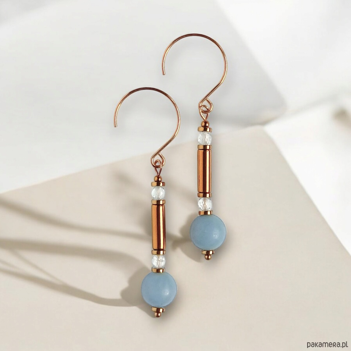 Wykonane z połączenia angelitu (matowe kule 10mm) i fasetowanego topazu (4mm) oraz rurek i przekładek ze złotego hematytu.