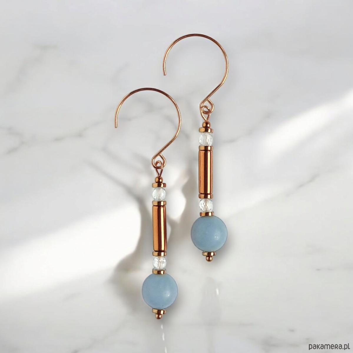 Wykonane z połączenia angelitu (matowe kule 10mm) i fasetowanego topazu (4mm) oraz rurek i przekładek ze złotego hematytu.