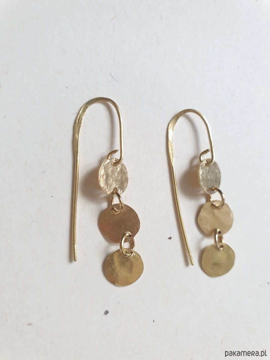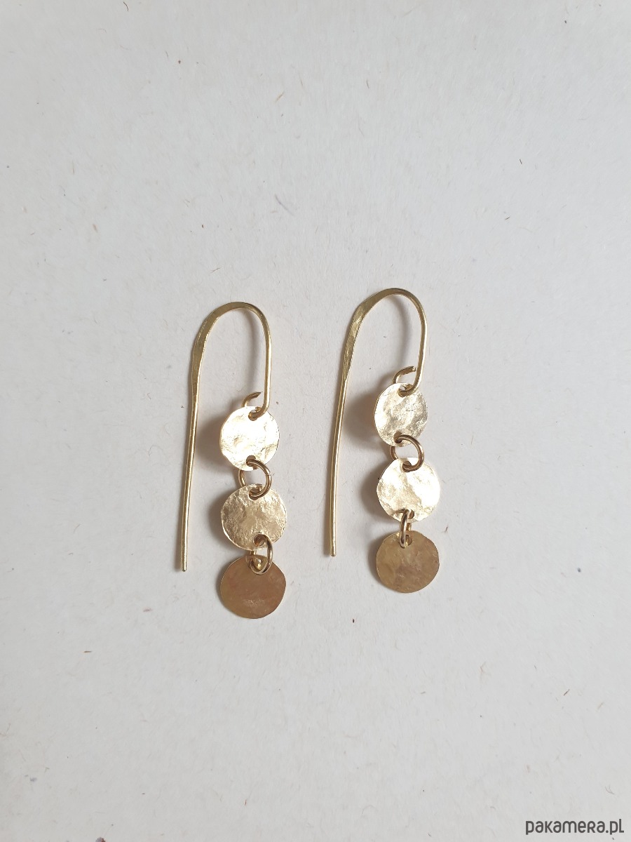 Minimalistyczne wiszące kolczyki z kolekcji ANTYK inspirowanej starożytnością. Tworzone ręcznie z surowego mosiądzu (ręcznie wycinane, młotkowane) z kółeczkami, błyszczące jak złoto :) Kolekcja inspirowana starożytnymi mozaikami, neolitycznymi płaskorzeźbami i starymi rycinami