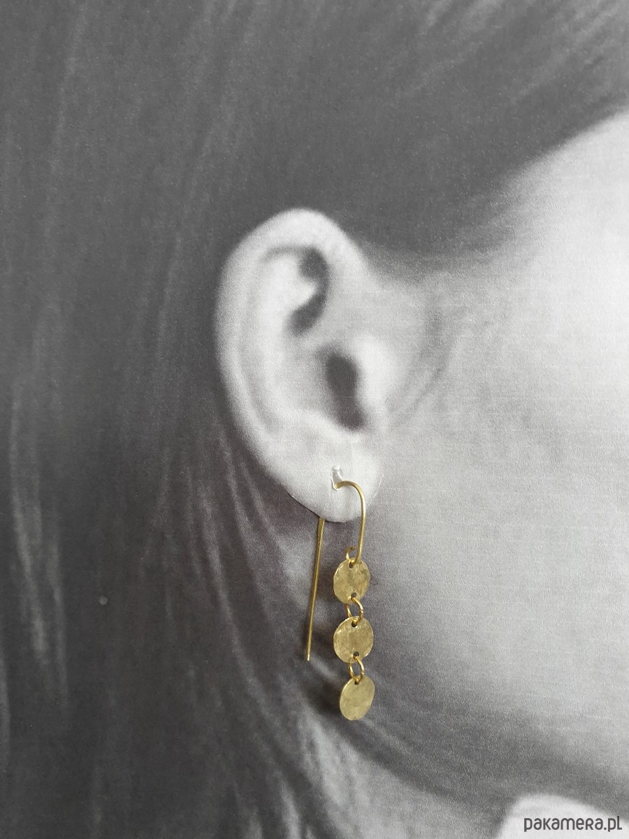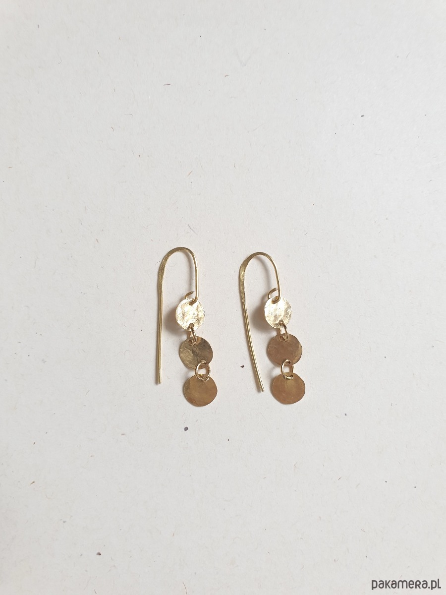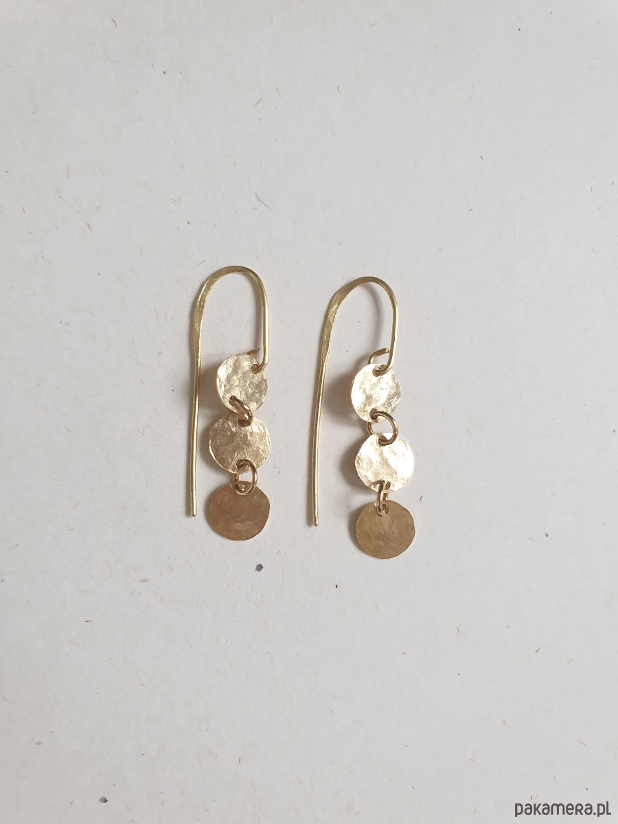 Minimalistyczne wiszące kolczyki z kolekcji ANTYK inspirowanej starożytnością. Tworzone ręcznie z surowego mosiądzu (ręcznie wycinane, młotkowane) z kółeczkami, błyszczące jak złoto :) Kolekcja inspirowana starożytnymi mozaikami, neolitycznymi płaskorzeźbami i starymi rycinami