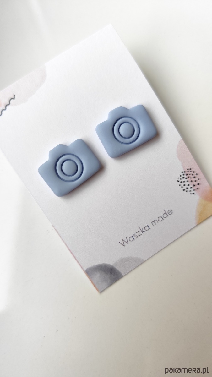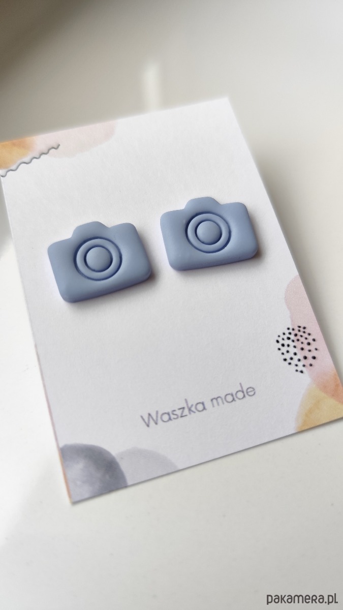 Kolczyki w kształcie aparatu fotograficznego. Szaro - niebieskie. Elementy metalowe to stal chirurgiczna.