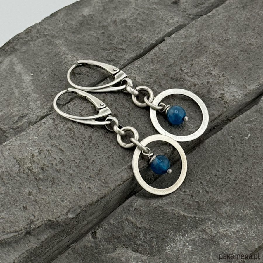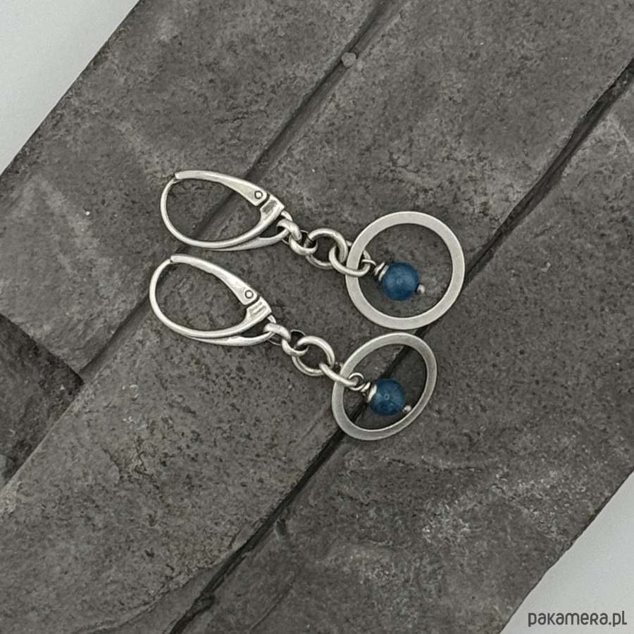 Minimalistyczne, nowoczesne i oryginalne kolczyki na co dzień. Wykonane w całości ze srebra próby 925 oraz gładkich kulek apatytu wielkości 0.5 cm. Całkowita długość kolczyków to ok. 4,2 cm, wielkość kol to 1,8 cm. Na życzenie mogę je wykonać bez oksydacji lub z innymi kamieniami. Ozdobnie zapakowane.