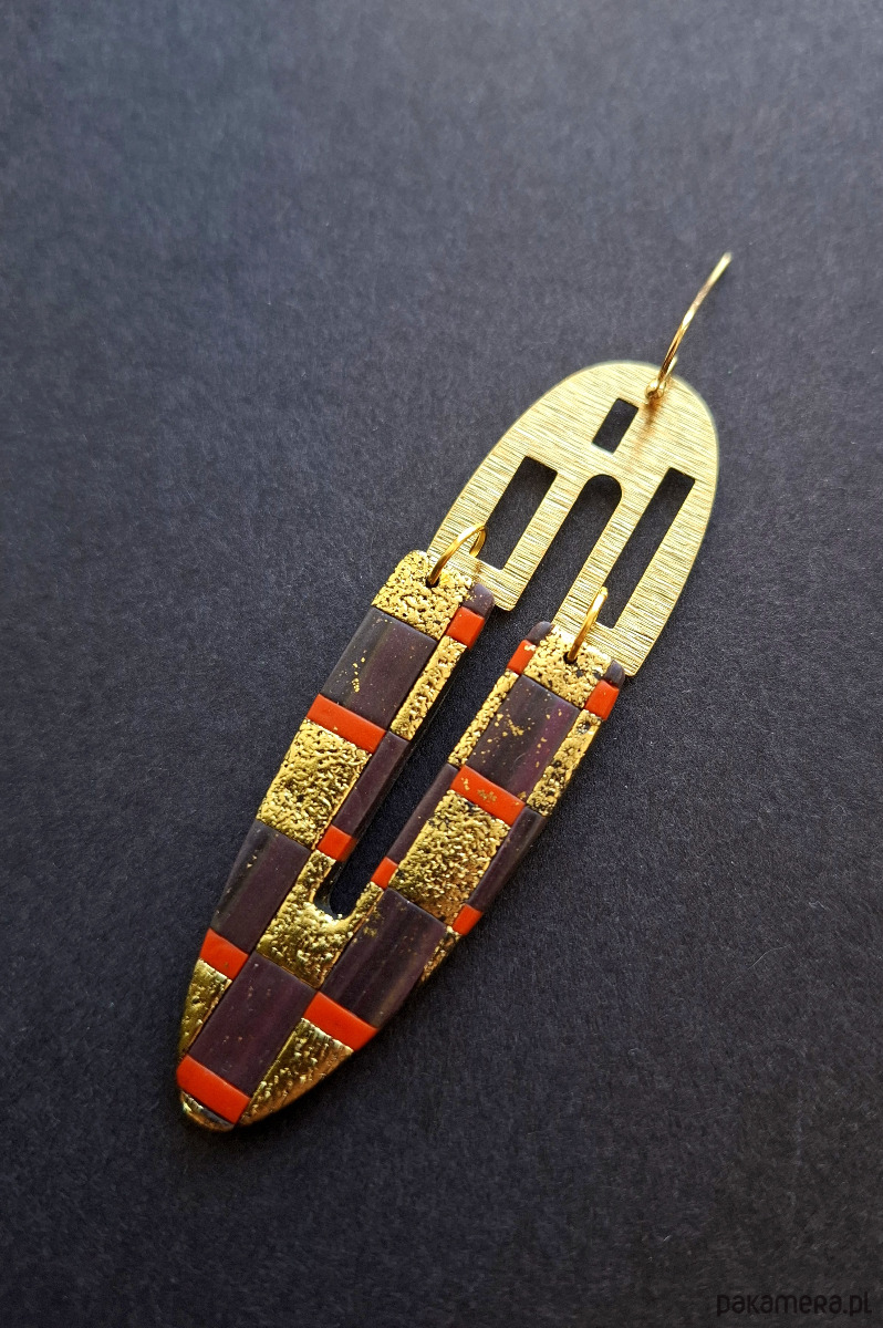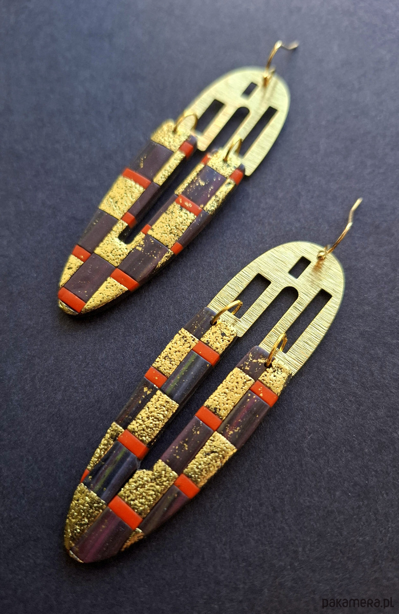 Kolczyki wiszące wykonane z wysokiej jakości glinki polimerowej z dodatkiem ozdobnych elementów metalowych. Jednostronne z prostymi, pozłacanymi i nieuczulającymi biglami. Wymiary: długość wraz z zapięciem: 9,2 cm; szerokość max. 2,8 cm.