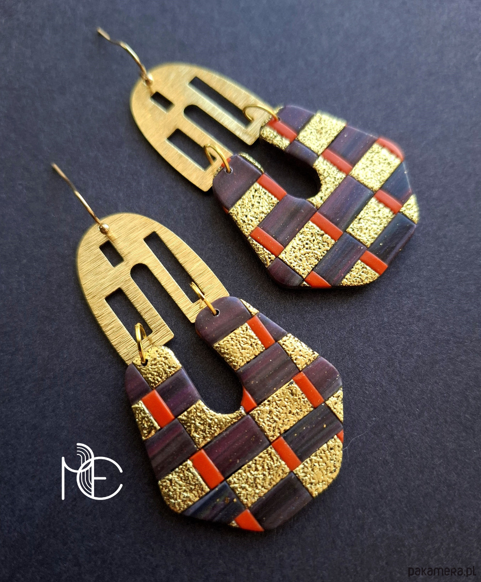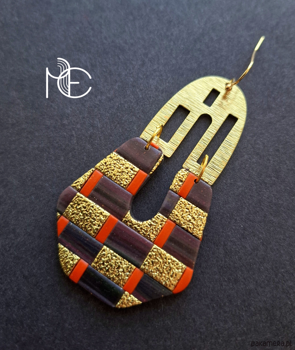 Kolczyki wiszące wykonane z wysokiej jakości glinki polimerowej z dodatkiem ozdobnych elementów metalowych. Jednostronne z prostymi, pozłacanymi i nieuczulającymi biglami. Wymiary: długość wraz z zapięciem: 7,8 cm; szerokość max. 3,8 cm. Wykonane w jedynym egzemplarzu.