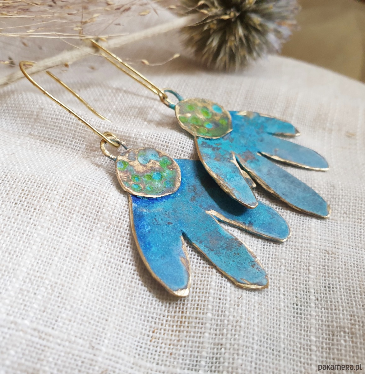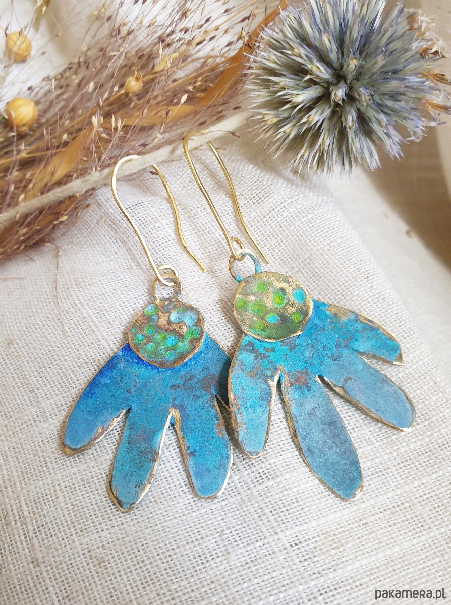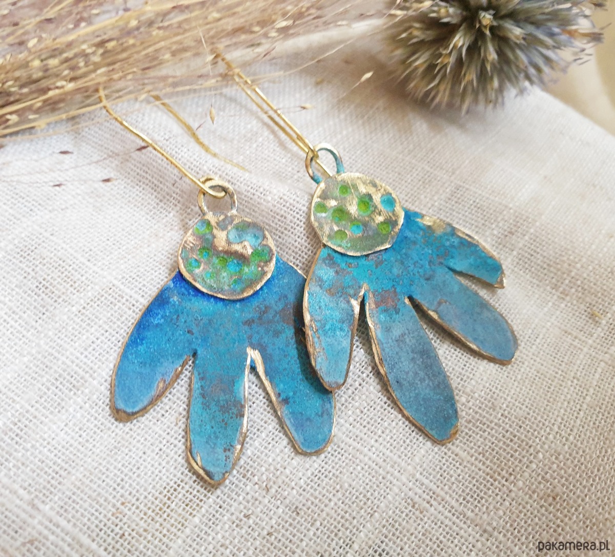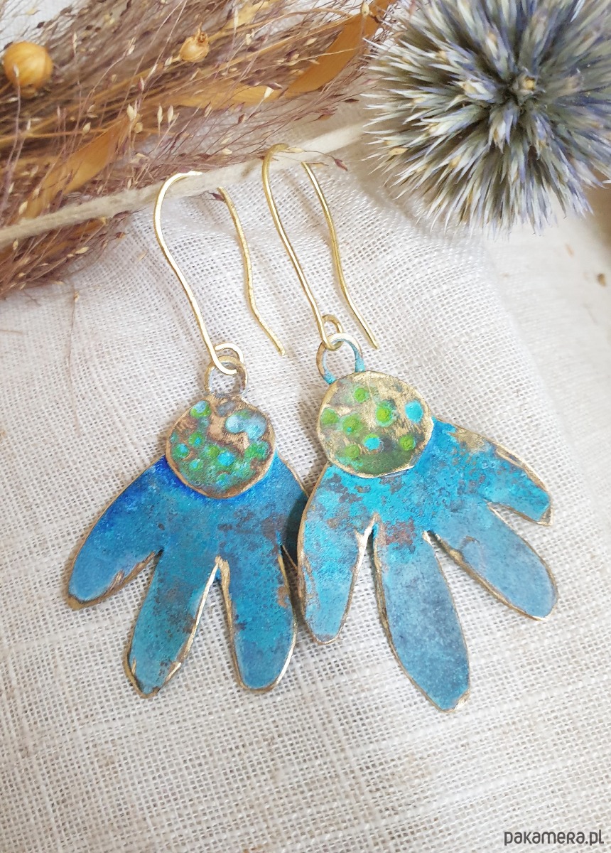 Wyjątkowe, długie kolczyki, kwiatowa forma wykonana ręcznie z mosiądzu i wykończona autorską patyną w odcieniach błękitu. Każdy element powstaje w całości w procesie ręcznej pracy, dzięki czemu biżuteria ma unikatowy, niepowtarzalny charakter.