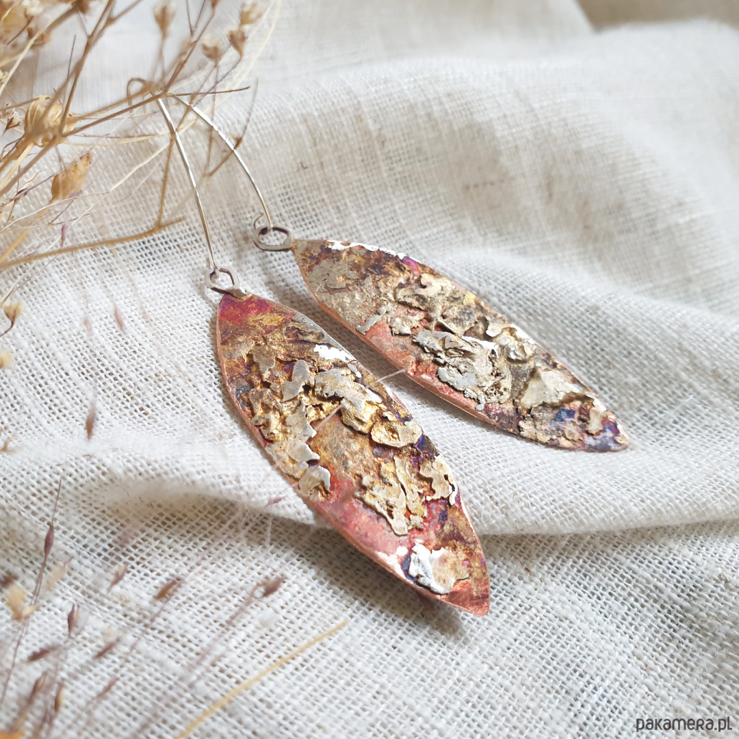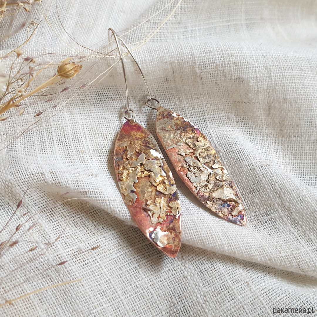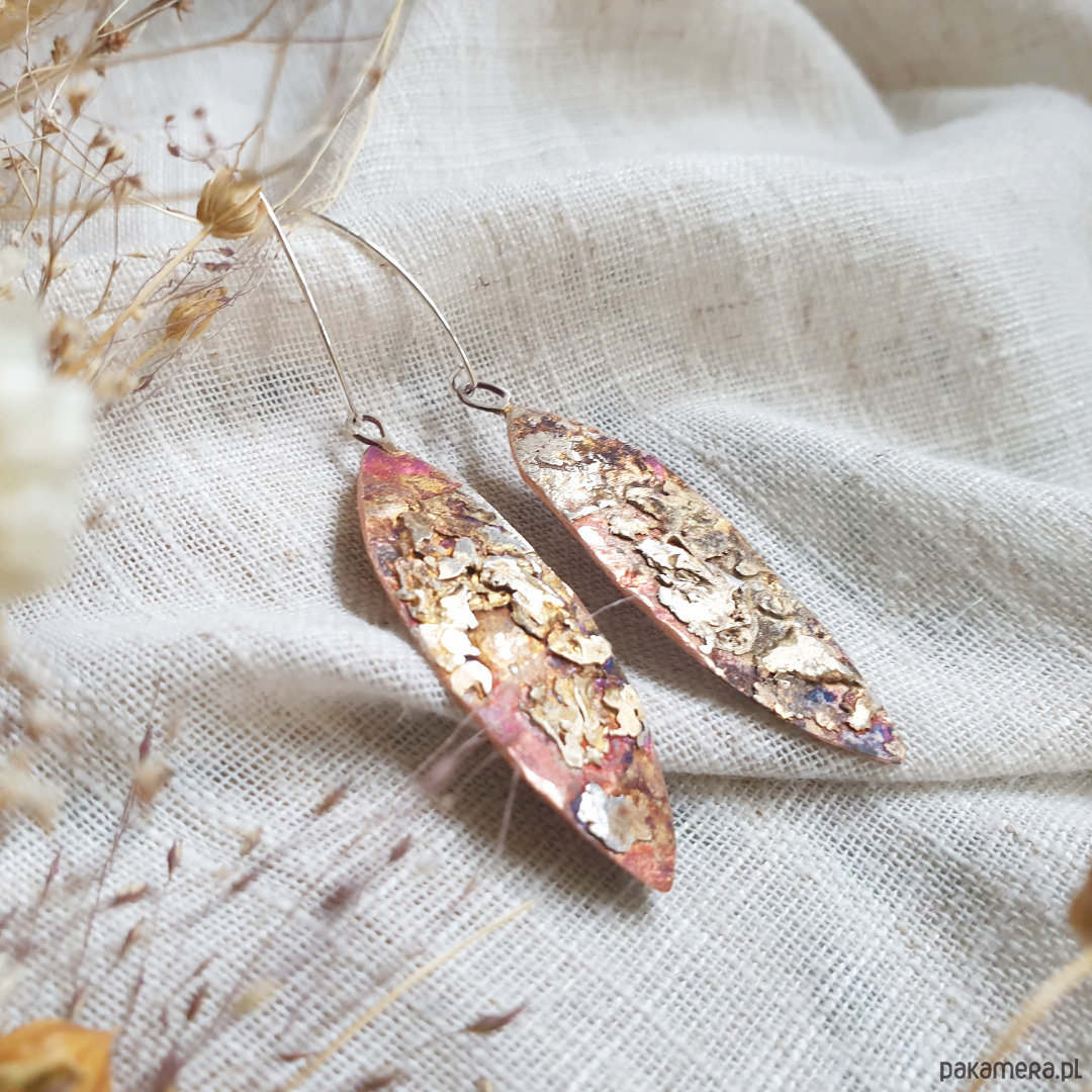 Wyjątkowe, ręcznie wykonane kolczyki w kształcie smukłych liści, stworzone z miedzi z delikatnie nalutowanymi srebrnymi elementami. Ich powierzchnia mieni się jesiennymi rudościami i odcieniami złota, przywodząc na myśl spacer w złotym lesie.
