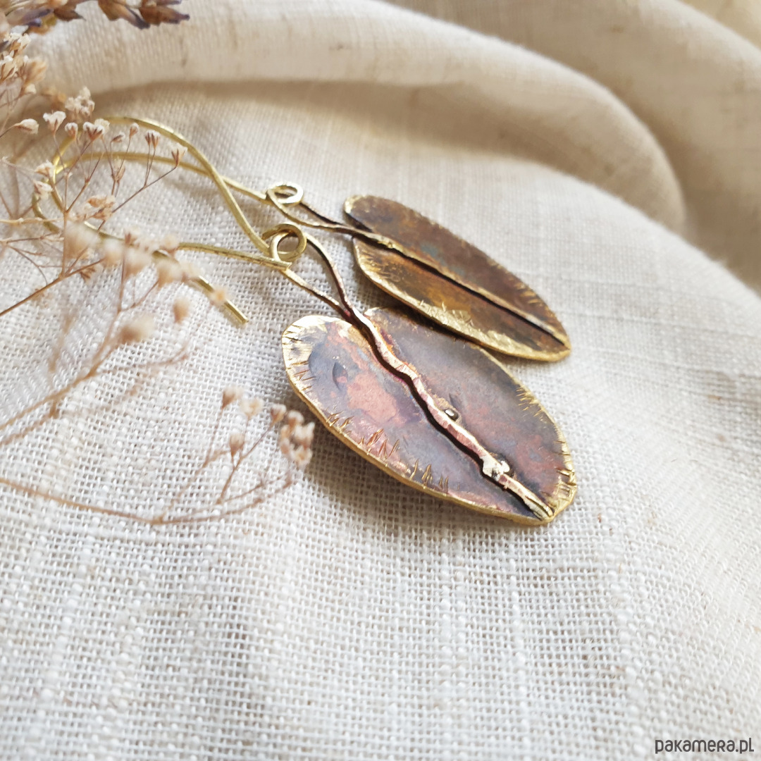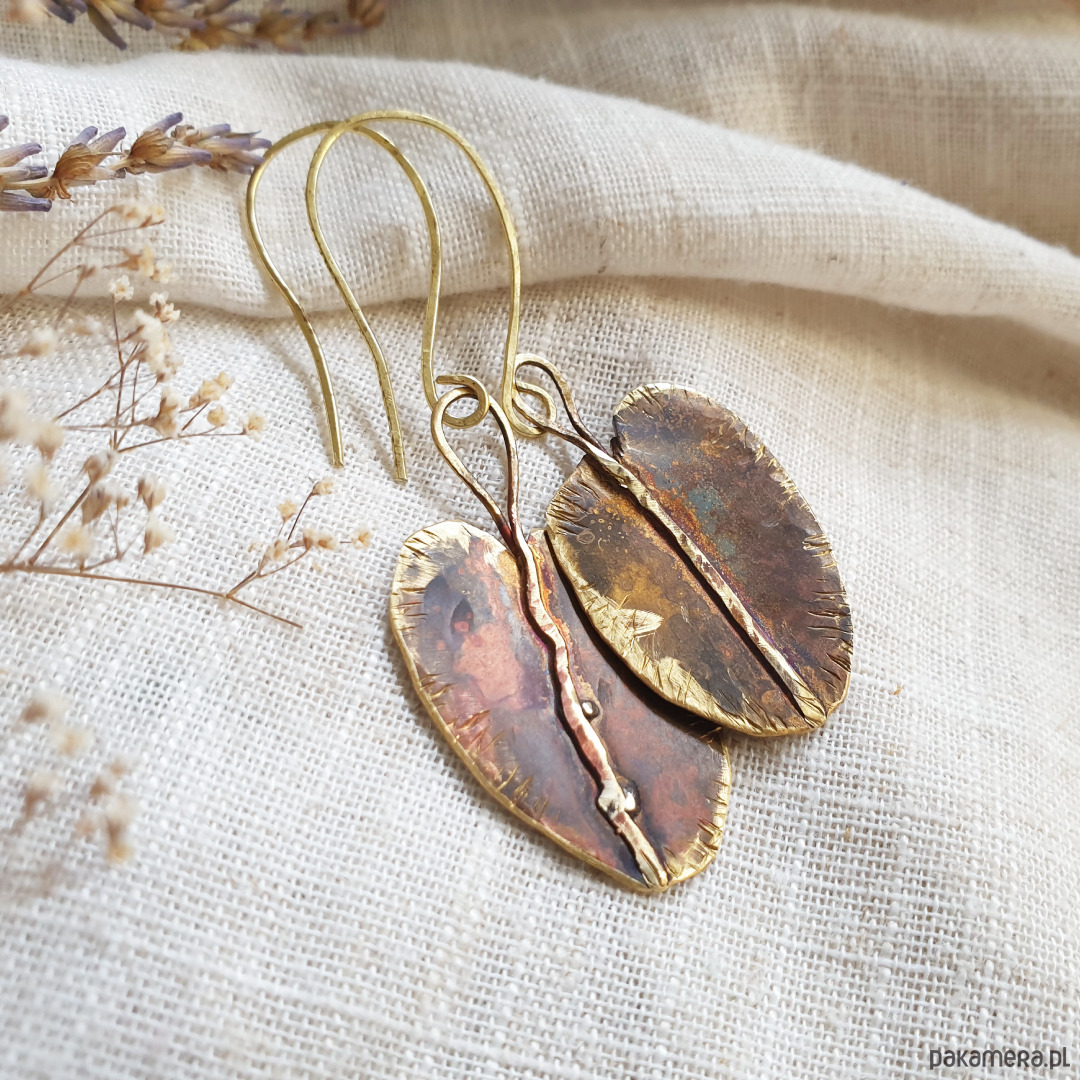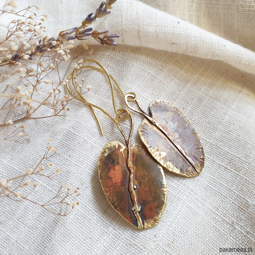Unikatowe, ręcznie wykonane kolczyki w kształcie delikatnych liści, stworzone z mosiądzu i poddane autorskiej oksydacji w odcieniach brązu, rudości i szarości.