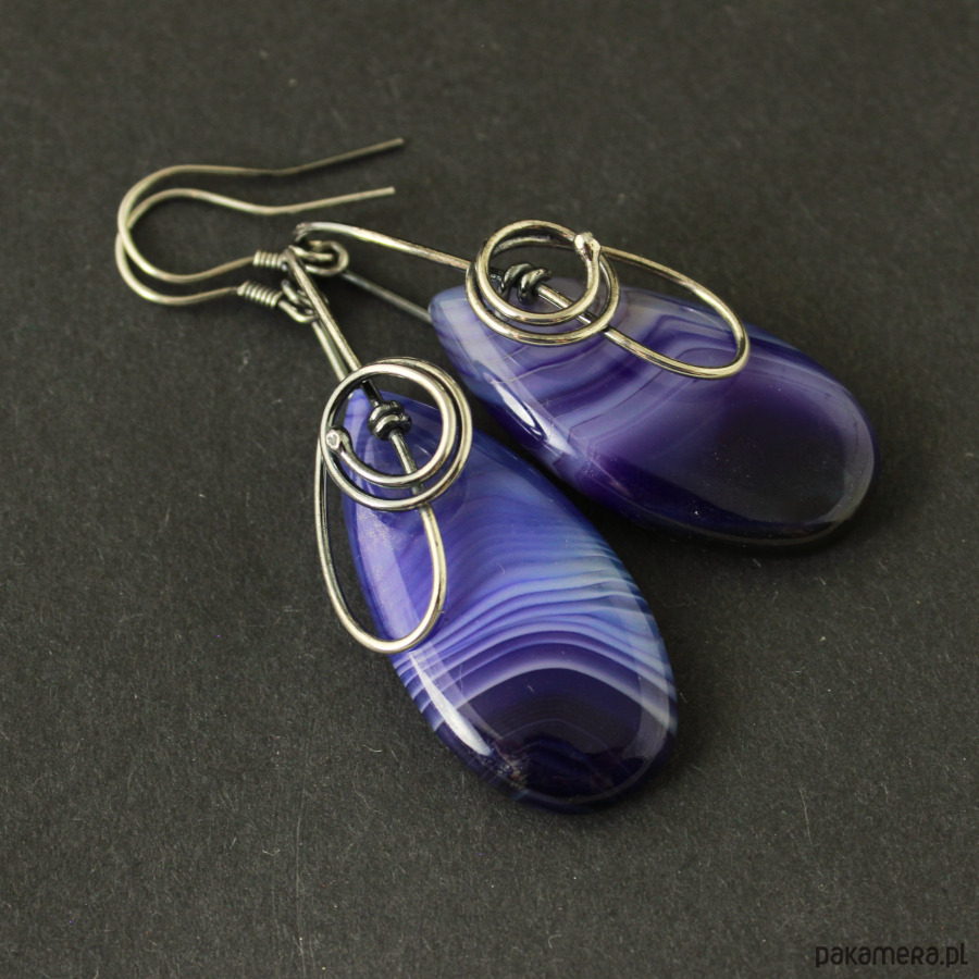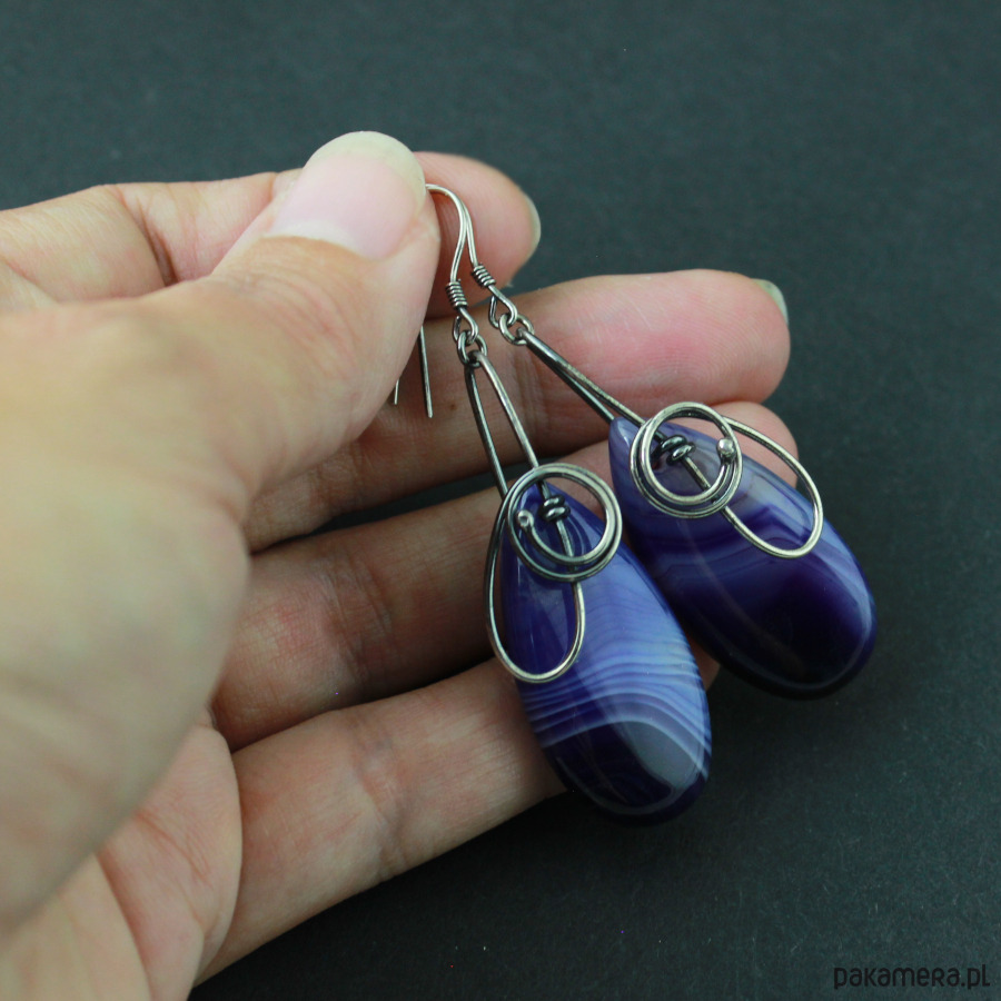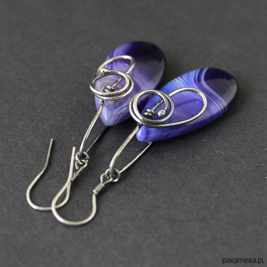 Agat w tych kolczykach układa się w kształt łagodnej kropli, jakby strużka światła zgęstniała i zatrzymała się na moment, pozwalając dostrzec swój wewnętrzny rytm. Na powierzchni kamienia widać subtelne przejścia fioletu: od głębokiego, niemal nocnego granatu, przez półprzezroczyste pasma lawendy, aż po chłodne smugi błękitu. Te warstwy wyglądają jak miniaturowe pejzaże – falujące linie na granicy światła i cienia, zapis drogi, jaką kamień odbył w swoim powolnym, geologicznym tańcu.