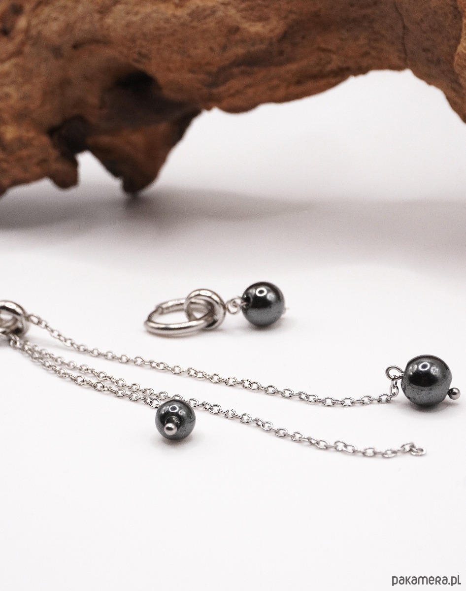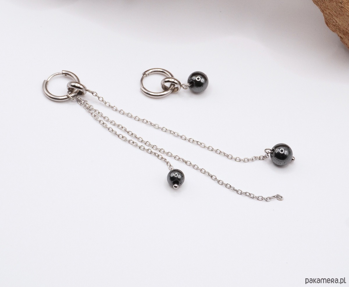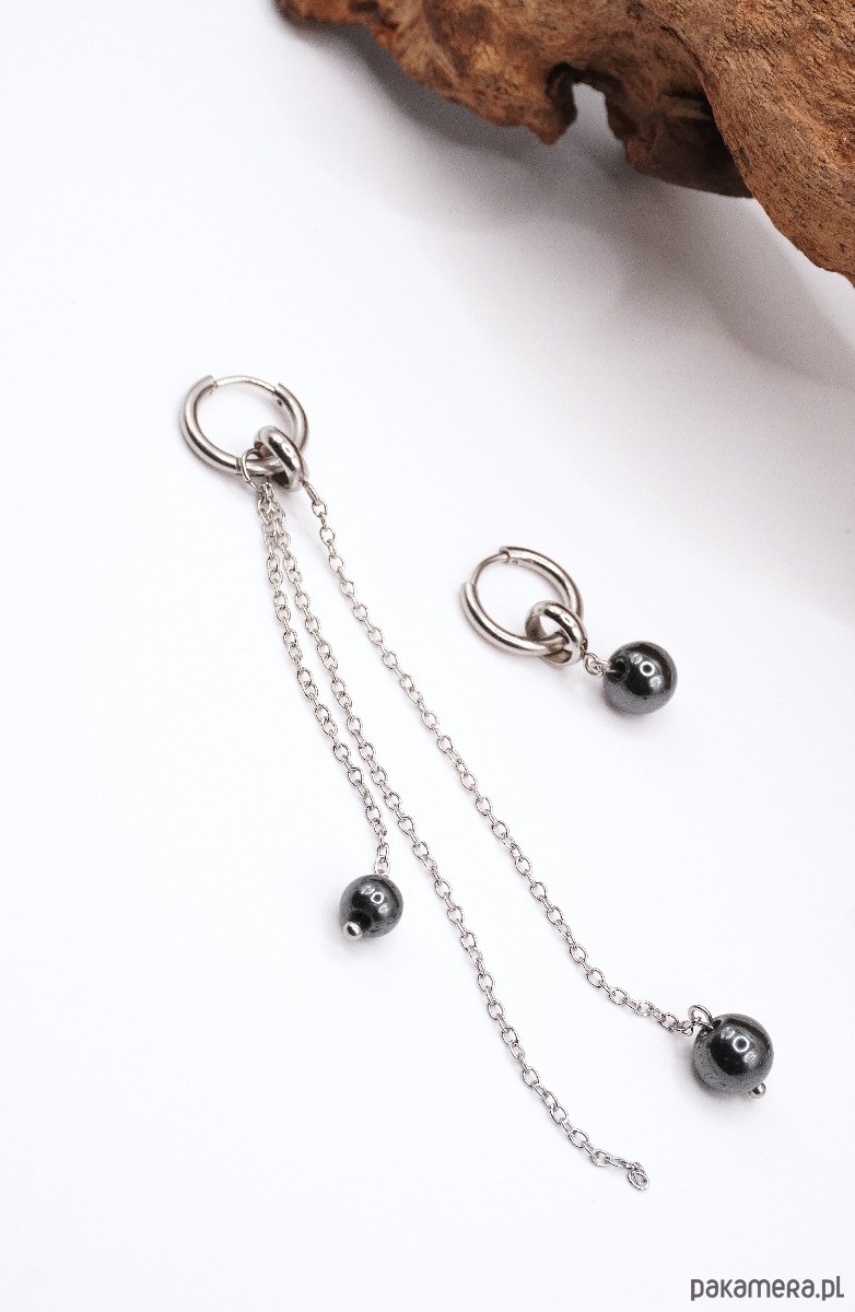 Delikatne, nowoczesne kolczyki wykonane z wysokiej jakości stali nierdzewnej i naturalnego kamienia hematyt. Subtelne łańcuszki zakończone połyskującymi kulkami tworzą lekki, ruchomy efekt, który pięknie podkreśla linię szyi i dodaje elegancji każdej stylizacji. Asymetryczna forma nadaje biżuterii unikalnego, artystycznego charakteru.