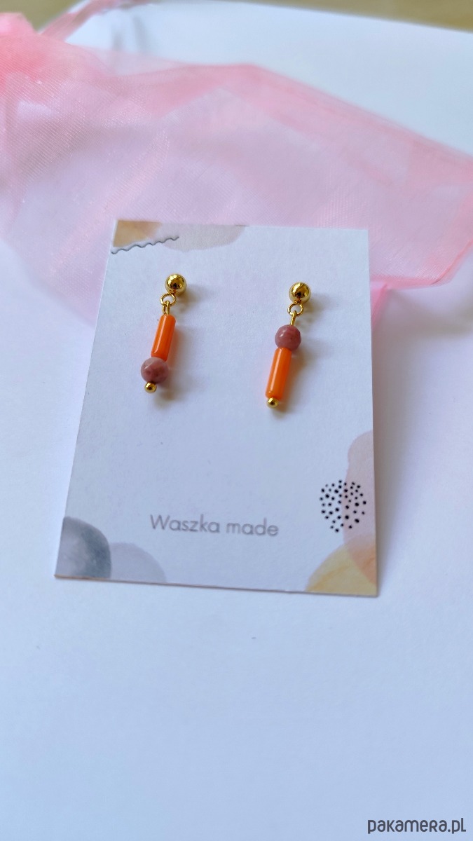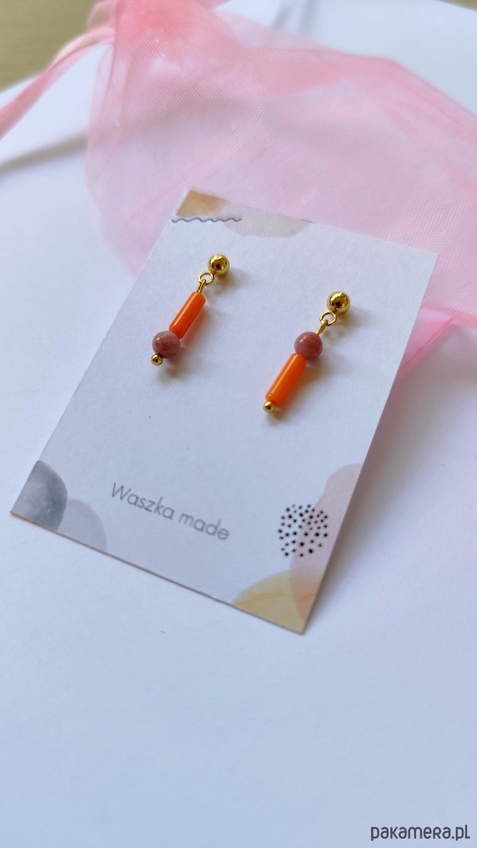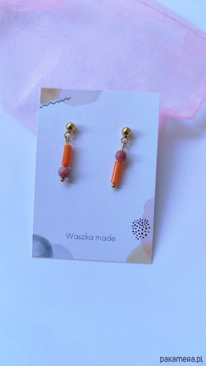 Asymetryczne kolczyki wykonane z koralu pomarańczowego oraz rodonitu.