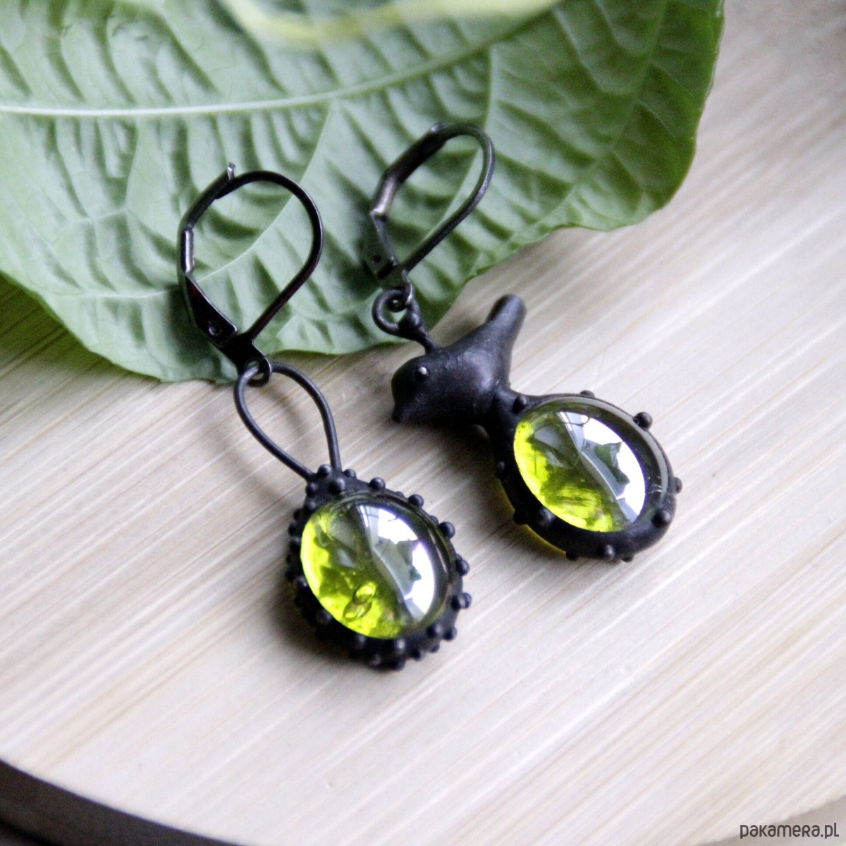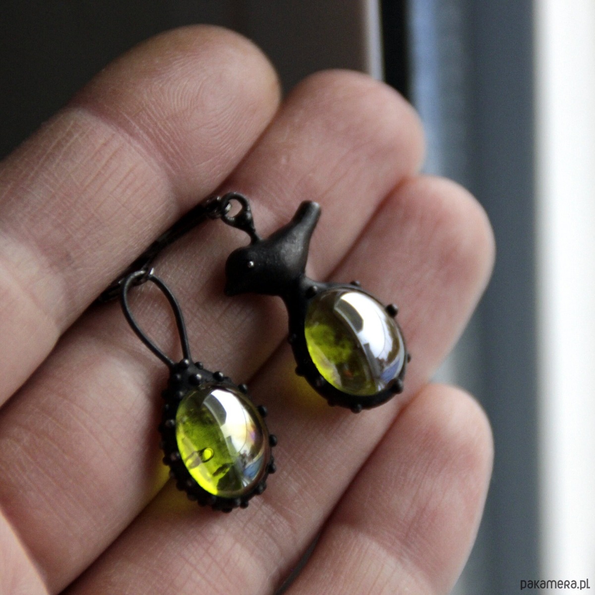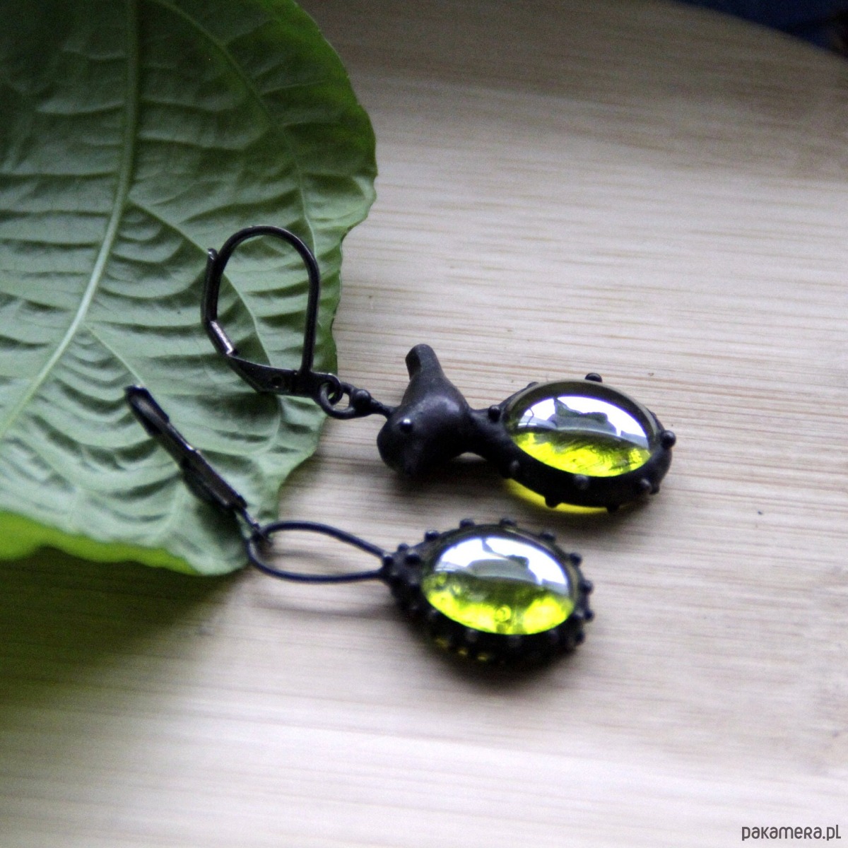 Asymetryczne kolczyki z motywem leśnym, wykonane ręcznie z miedzi, stali, cyny i szkła. Pokryte patyną, pokryte środkiem przeciwutleniającym, szlifowane, polerowane. Niezwykła i mocna, estetyczna biżuteria leśna. Wszystkie elementy są wykonane ręcznie, co zapewnia indywidualność każdego produktu wykonanego w warsztacie Yadovito. Stop cyny i miedzi jest polerowany roztworem wykończeniowym, aby nadać biżuterii szlachetny wygląd, a jednocześnie zapobiec utlenianiu się metalu. W kolczykach wykorzystano szkło topione w specjalnym piecu. Po stopieniu szkło nabiera niemal niepowtarzalnego kształtu i niesamowitych odcieni kolorów, które mienią się w świetle. Kolor: czarny/zielony. Rozmiar około 2,5/1,5 cm
