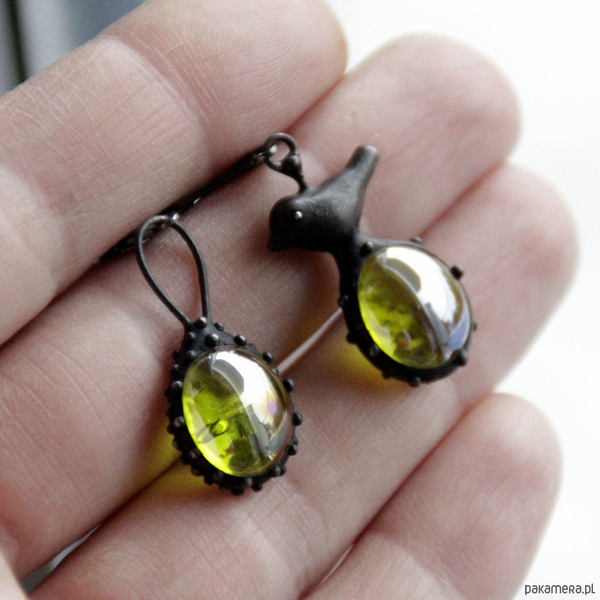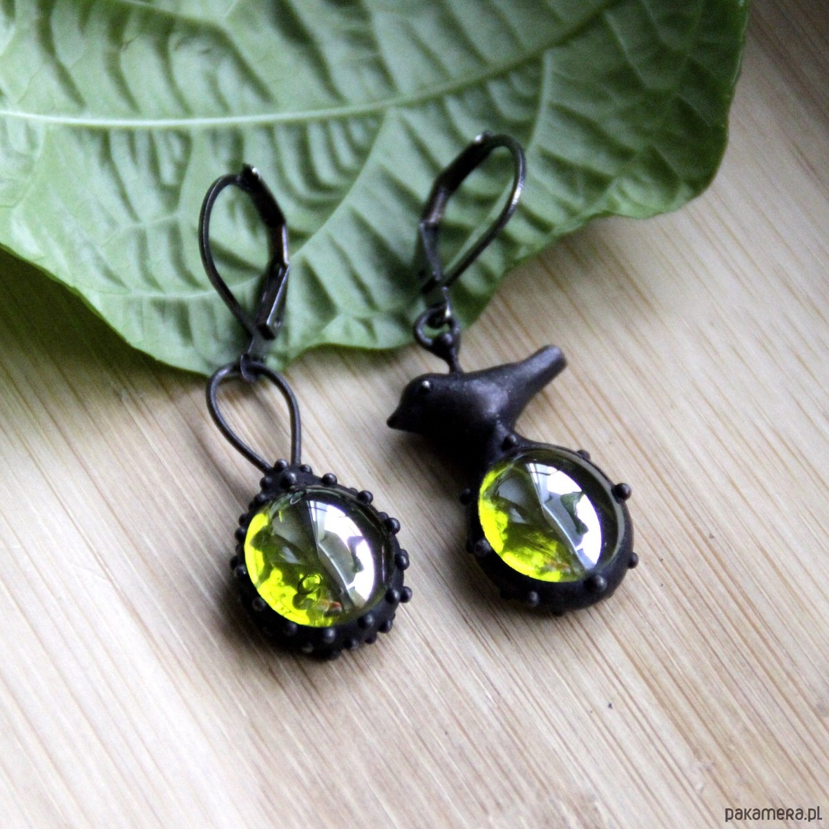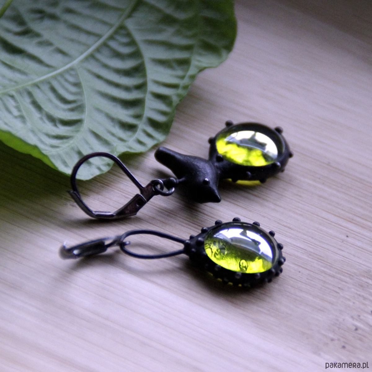 Asymetryczne kolczyki z motywem leśnym, wykonane ręcznie z miedzi, stali, cyny i szkła. Pokryte patyną, pokryte środkiem przeciwutleniającym, szlifowane, polerowane. Niezwykła i mocna, estetyczna biżuteria leśna. Wszystkie elementy są wykonane ręcznie, co zapewnia indywidualność każdego produktu wykonanego w warsztacie Yadovito. Stop cyny i miedzi jest polerowany roztworem wykończeniowym, aby nadać biżuterii szlachetny wygląd, a jednocześnie zapobiec utlenianiu się metalu. W kolczykach wykorzystano szkło topione w specjalnym piecu. Po stopieniu szkło nabiera niemal niepowtarzalnego kształtu i niesamowitych odcieni kolorów, które mienią się w świetle. Kolor: czarny/zielony. Rozmiar około 2,5/1,5 cm
