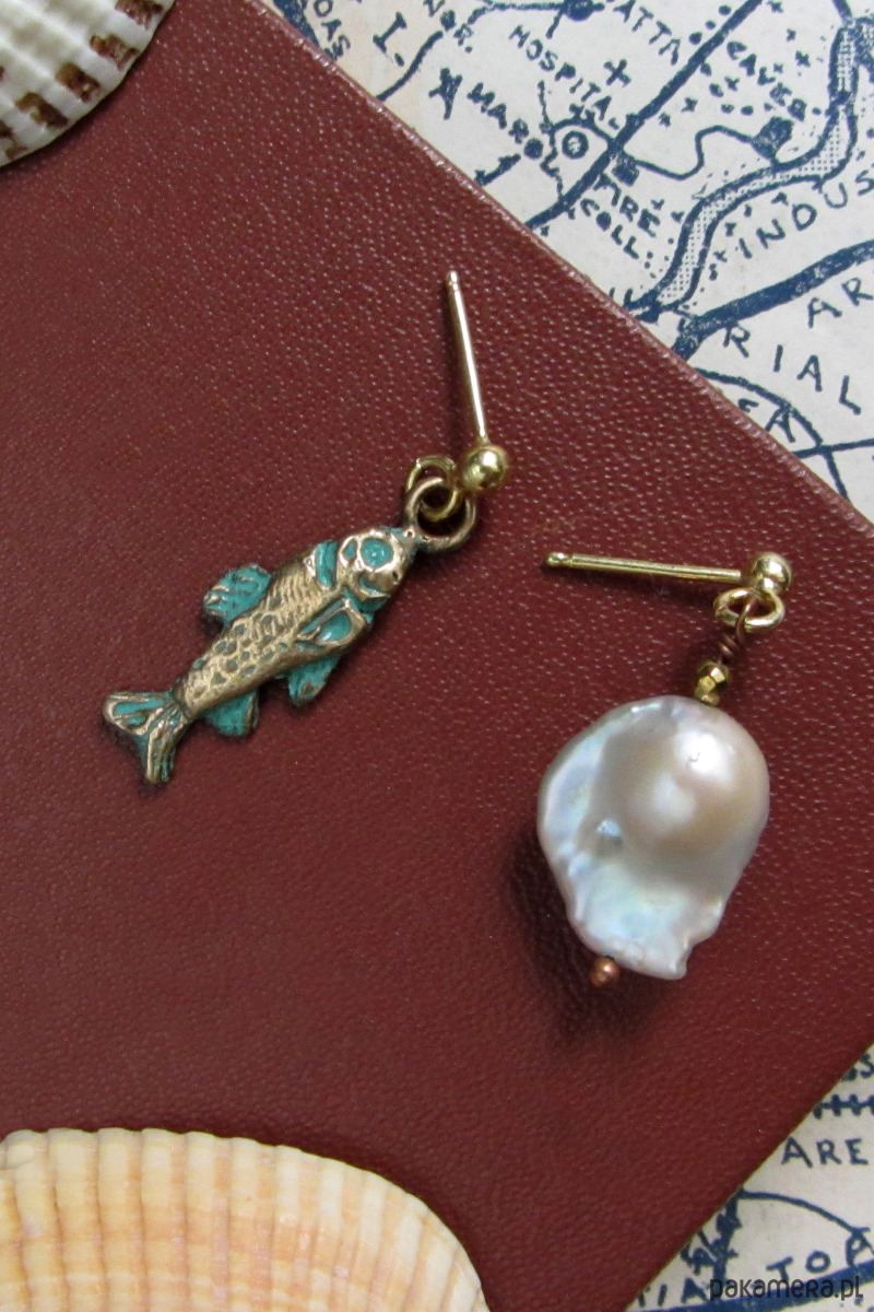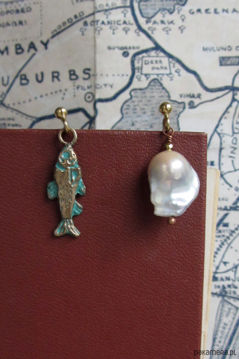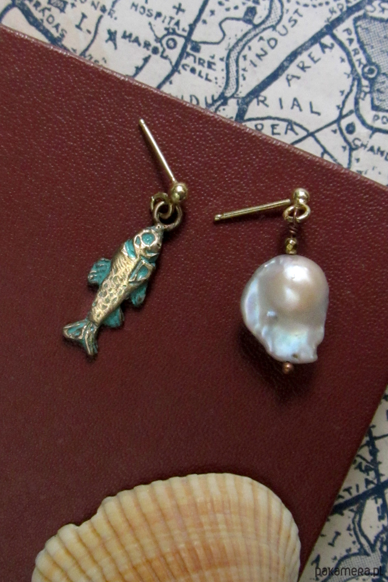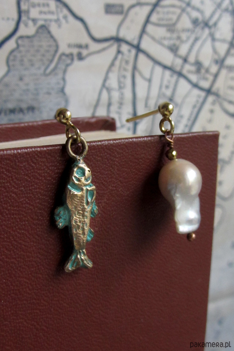 Wakacyjne kolczyki z zawieszką przedstawiającą rybkę inspirowaną sztuką starożytnego Rzymu oraz perłą baroque. Ryba jest symbolem obfitości, mądrości, duchowości, szczęścia i dobrobytu. Zawieszka wykonana od podstaw metodą wosku traconego z brązu w krakowskiej pracowni.