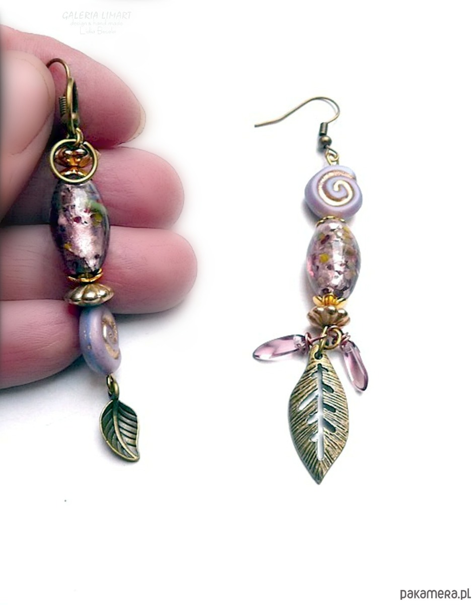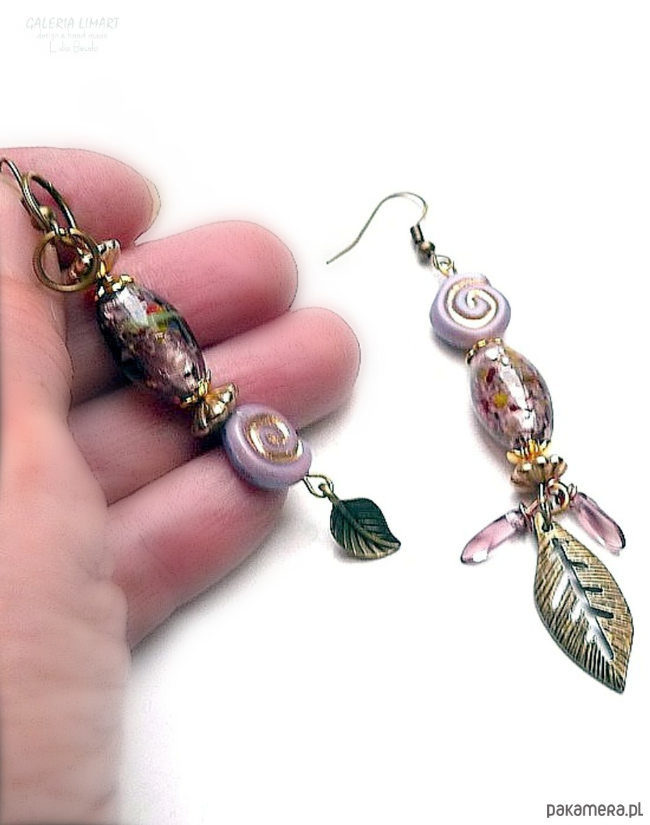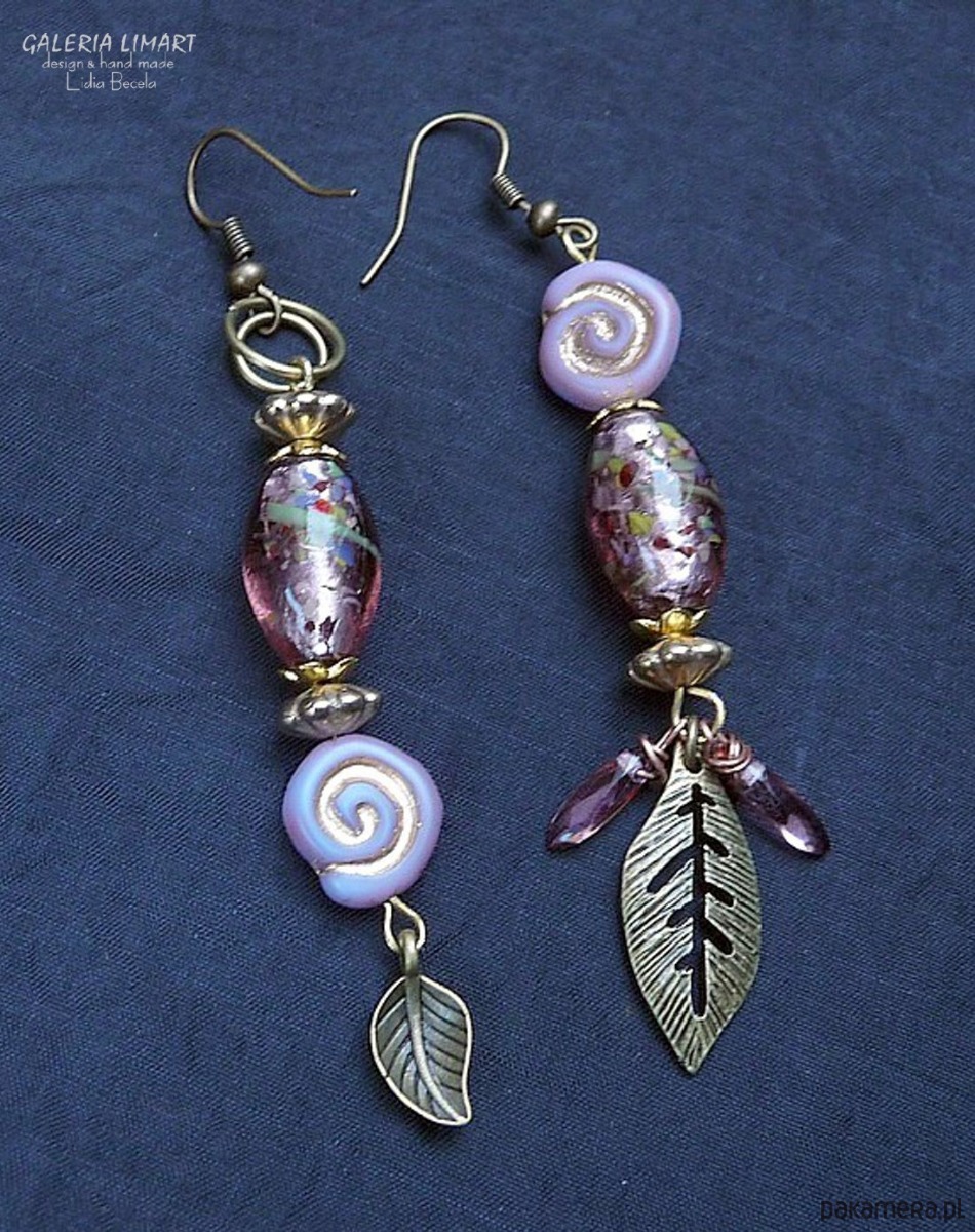 Autorskie kolczyki z pięknego szkła weneckiego w fantastycznej fioletowo-różowo-złotej tonacji. Ciekawe w swej formie dzięki zastosowaniu asymetrii. Każdy kolczyk jest inny, ale sumarycznie tworzą całość, co dało efekt niezwykły i unikatowy.